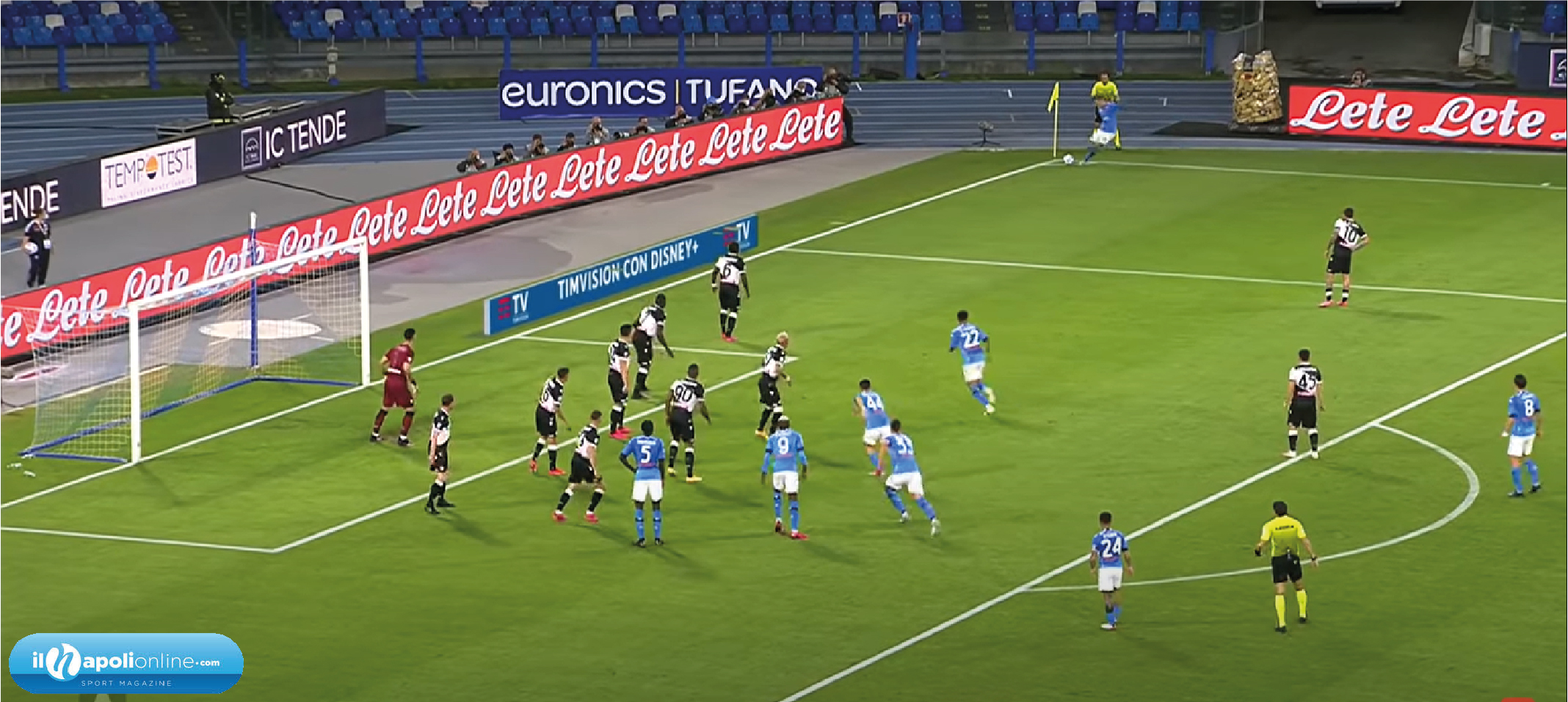 Dal calcio d’angolo vediamo che il Napoli è nettamente in inferiorità (figura 8), infatti ci sono 5 azzurri in area di rigore contro 8 calciatori di movimento più il portiere, per un totale di 9 avversari. Al colpo di testa di Manolas la i difendenti salgono sulla linea dell’area piccola, nel frattempo Di Lorenzo riesce ad inserirsi e si trova la respinta del portiere. Non può far altro che insaccare per calare il poker azzurro.