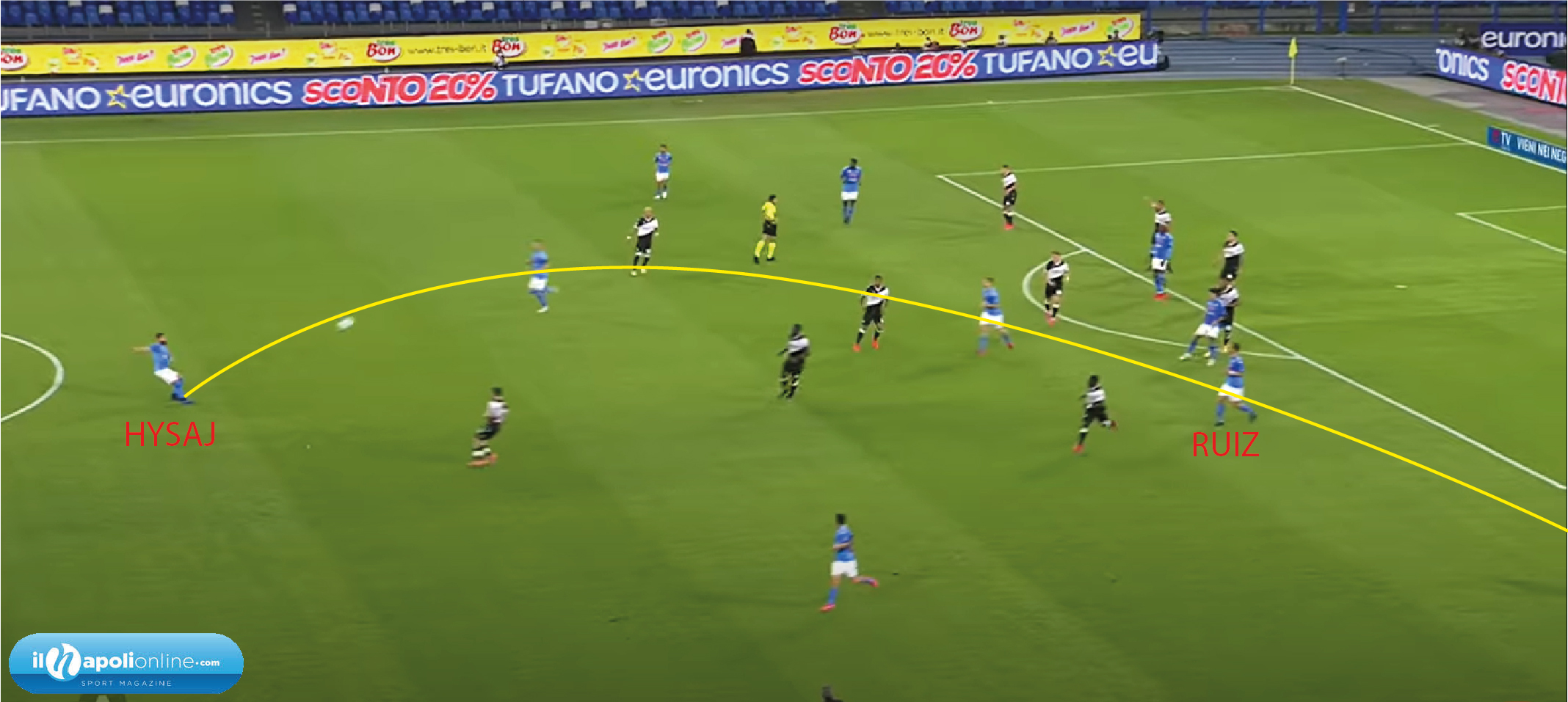 Questa volta il lancio è di Hysaj che allarga il gioco su Zielinski (figura 3). Il polacco dopo aver messo la palla a terra, ritorna centrale per Fabian Ruiz (figura 4). Lo spagnolo dopo aver fatto un grandissimo stop si prepara al tiro (figura 5), mettendo la palla sul palo lontano dove il portiere non può arrivarci.