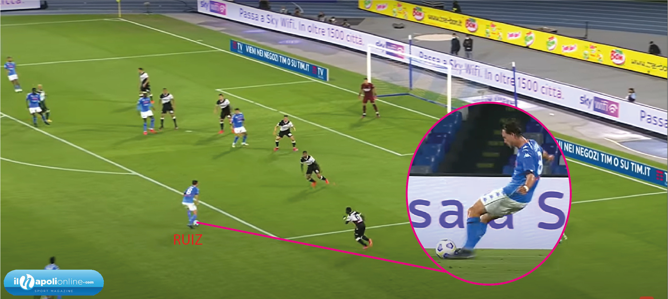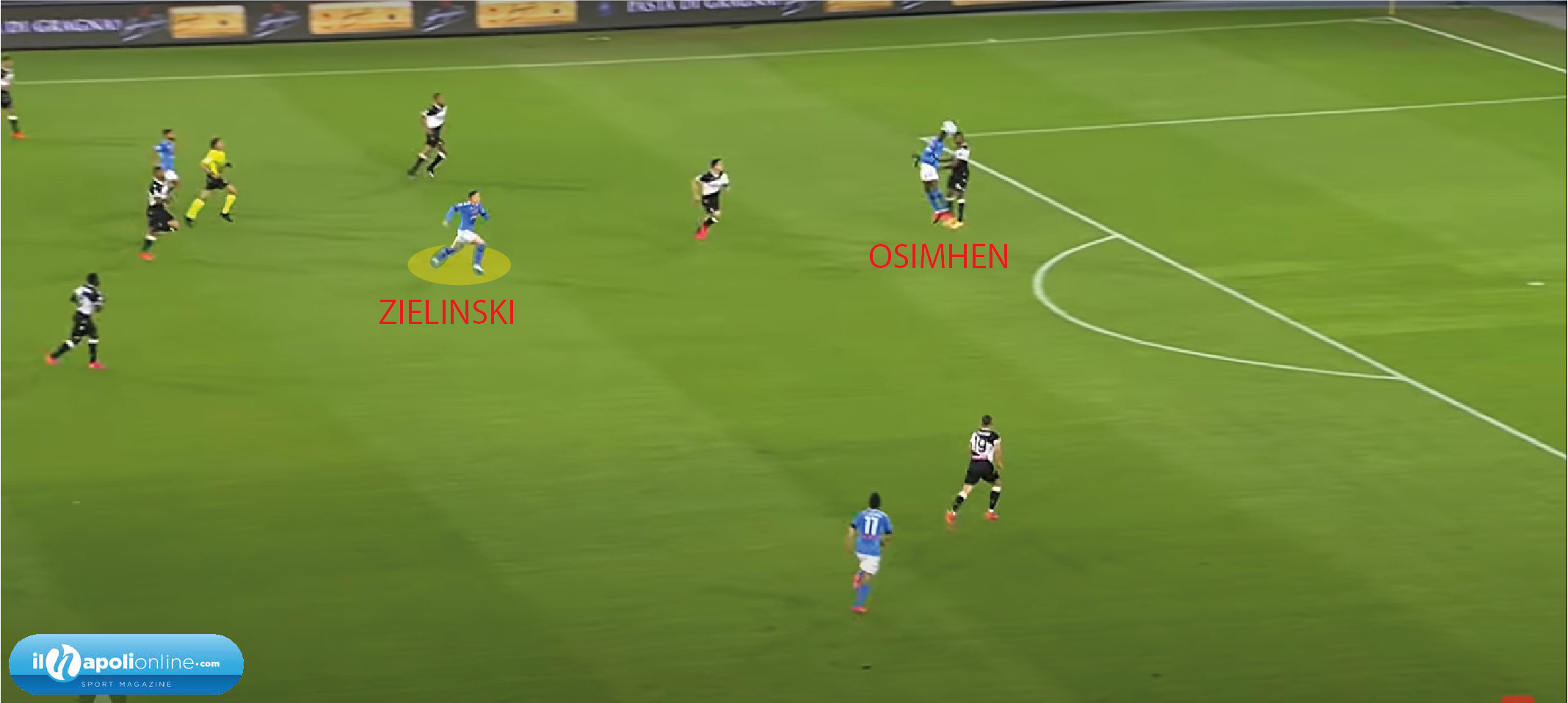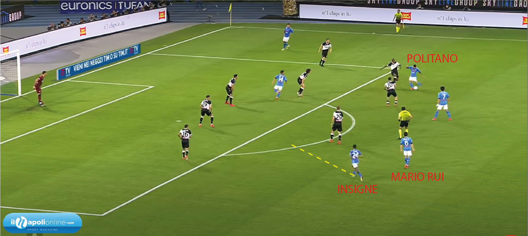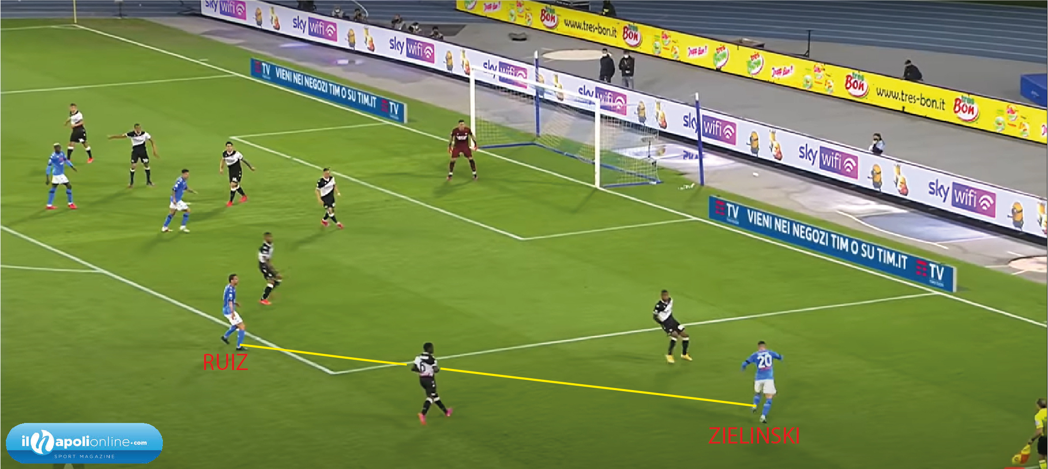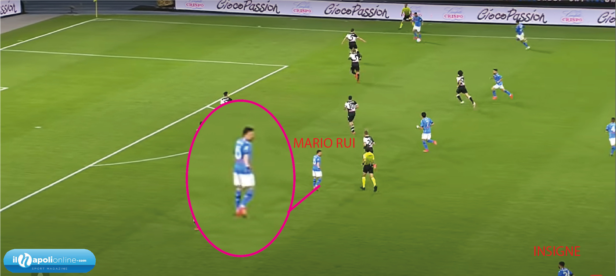Il quinto goal è sintomo di crescita della squadra e di non volersi fermare. Infatti arriva al 91′ minuto, dove l’azione parte da un cambio di gioco di Insigne e Mario Rui che tende a salire. Ma lo stesso terzino del Napoli (figura 10), tende a chiamare e far salire il capitano per creare superiorità. Nello stesso momento l’azione diventa personale di Politano che vorrebbe partecipare anche lui con il goal. Ma il tiro respinto finisce proprio sui piedi di Lorenzo Insigne, che con uno stop di petto ed un tiro a volo mette il sigillo per il pokerissimo e per il suo 18° goal in questa stagione.