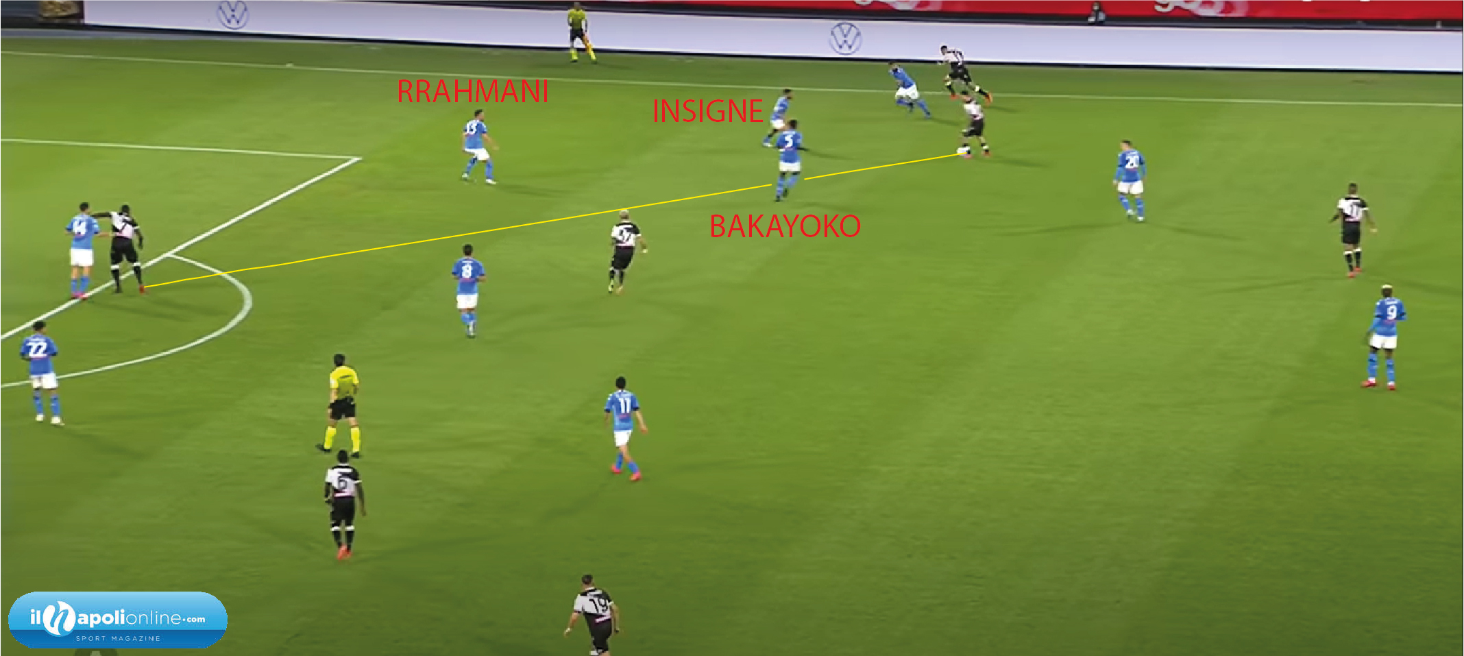 Goal subito per un errore degli errori di posizione, infatti vediamo (figura 1) Bakayoko che va a chiudere l’avversario senza chiudere la linea di passaggio. Seppur lì in quella zona di campo ci sono già Hysaj che segue l’avversario sulla fascia, ed Insigne che affronta l’avversario con la palla. Il secondo errore di posizione è quello di Rrahmani che si è fatto trascinare in zona palla, infatti bastava lasciare già il 3 contro 2 che si è creato in zona palla e restare più vicino al compagno di difesa Manolas, per anticipare il passaggio. Bravo poi Okaka a tenere palla e con la sua fisicità (figura 2), a girarsi e tirare cercando il palo più lontano. Meret sul tiro è incolpevole in quanto non vede partire la palla perchè coperto da Rrahmani, e forse c’è anche una leggera deviazione.