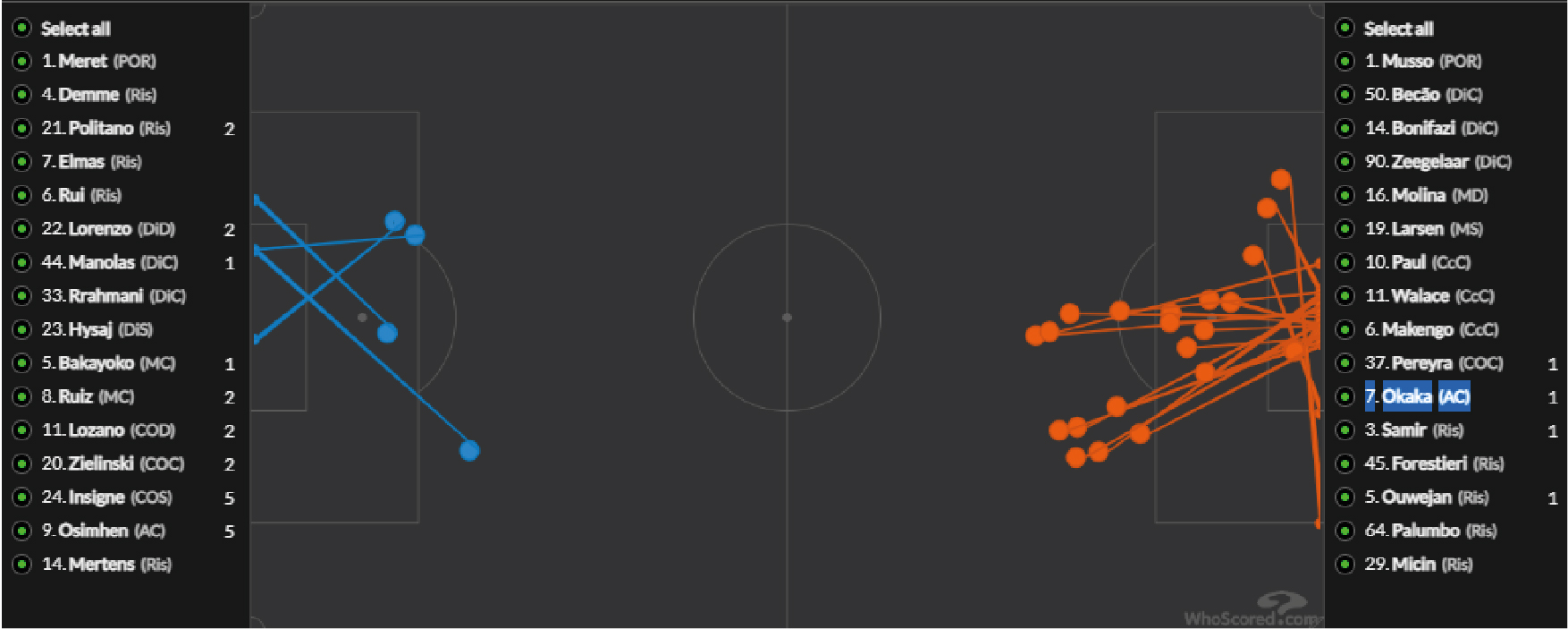 Le statistiche ci aiutano a capire l’andamento della partita, infatti vediamo (figura 3) gli azzurri aver effettuato ben 22 tiri verso la porta avversaria ed averne subiti solo 4. Ma il dato che sembra stupire è il fatto che 1 solo tiro è stato effettuato dall’Udinese nello specchio della porta facendo goal, rispetto agli altri 3 che sono finiti fuori.