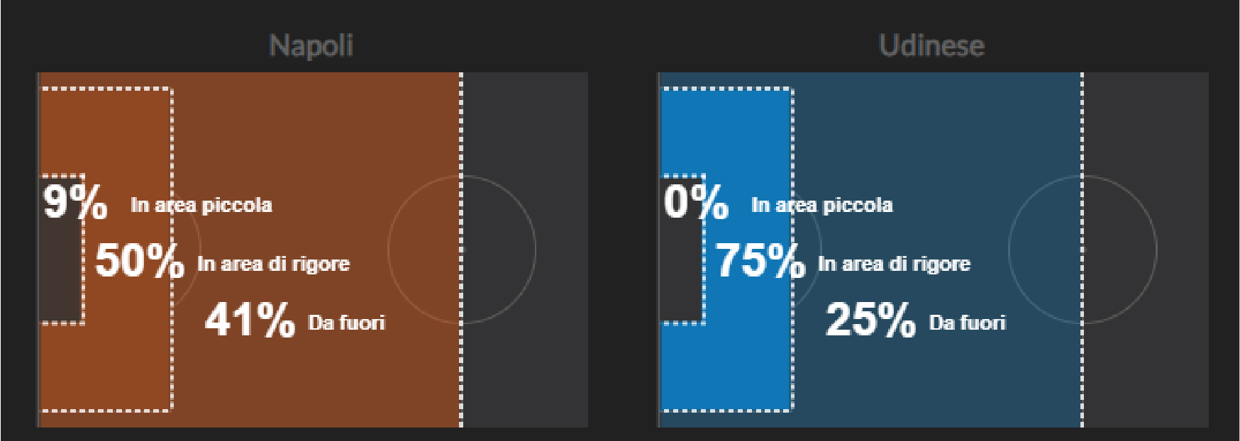 Invece per le zone da dove sono arrivati i tiri possiamo vedere (figura 4), che da dentro l’area piccola c’è lo 0%, ovvero il Napoli non ha ricevuto nessun tiro, segno di crescita visto che contro lo Spezia ha ricevuto il 13% di tiri dall’area piccola.