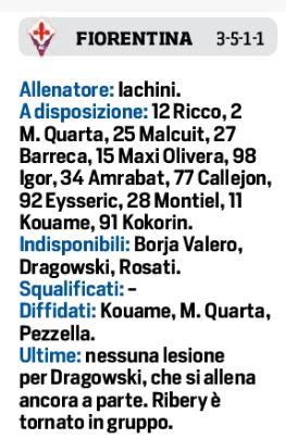 Domani allo stadio “Franchi”, nel lunch-match, la Fiorentina affronterà il Napoli per la penultima giornata di campionato. I toscani sono già salvi, ma Iachini manderà in campo quasi il miglior undici, ad eccezione di Dragowski, assente per infortunio, pronto Terracciano. In compenso recupero per Ribery che agirà alle spalle di Vlahovic. Venuti avanti su Igor. In casa azzurra due i ballottaggi. Meret-Ospina, con il friulano avanti sul portiere colombiano. L’altro è a destra tra Lozano-Politano, con il messicano che dovrebbe spuntarla rispetto all’ex di Sassuolo e Inter. A centrocampo infine ritorno di Demme al fianco di Fabian Ruiz.