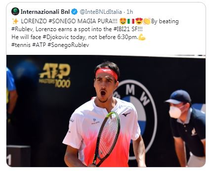 Così sul profilo twitter della SSC Napoli ci sono le congratulazioni per il tennista piemontese Lorenzo Sonego che ha sconfitto ai quarti di finale del Torneo Atp di Roma, Master 1000 il russo Rublev. L’azzurro ha vinto con il punteggio di 3-6;6-4;6-3. Oggi pomeriggio Sonego affronterà in semifinale alle ore 18,30 Novak Djokovic.