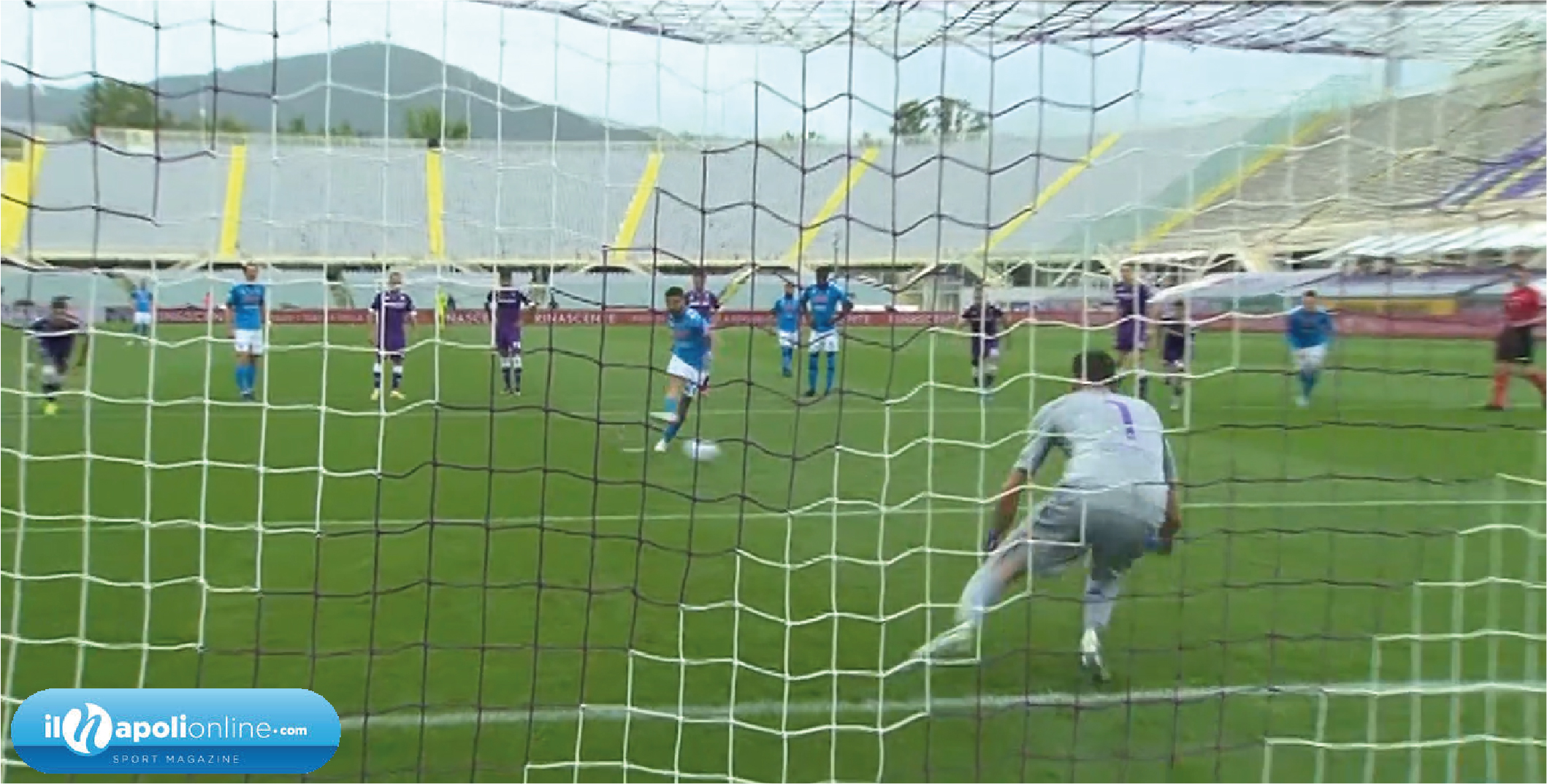 Trattenuta evidente che il VAR, Chiffi fa rivedere (figura 1). Il rigore c’è, in quanto Milenkovic perdendo il contatto con Rrahmani lo trattiene vistostamente. Sul dischetto ci và capitan Insigne, ma il portiere di origini campane, Terracciano individua il lato del rigore e lo para. Non riesce a trattenere la palla che ritorna sui piedi di Insigne che di tap-in segna il vantaggio azzurro tirando un sospiro di sollievo. Il capitano non aveva mai sbagliato dure rigori nella stessa stagione. Quest’anno calcistico il 2020/2021 oltre a questo di Firenze, pesa il rigore sbagliato in Supercoppa Italiana contro la Juventus. Di confronto però ci sono anche i 7 rigori segnati.