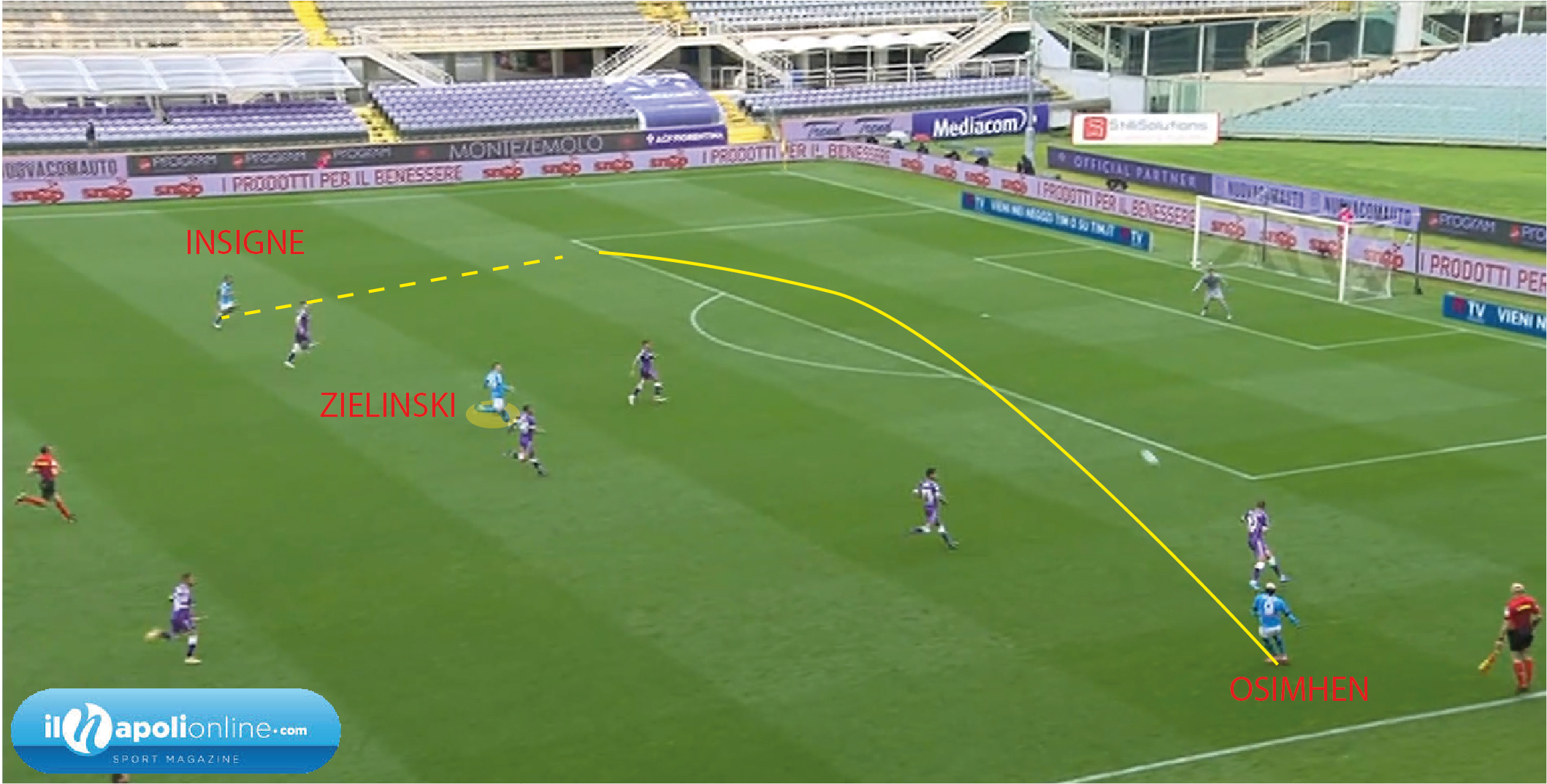 L’azione del goal azzurro parte dal cambio di gioco di Osimhen per Insigne (figura 3). Nel frattempo vediamo che Zielinski corre per vie centrali per dare un punto di riferimento agli azzurri. Il capitano mette palla a terra e prova ad accentrarsi, ma il polacco con un contromovimento ad andare verso la porta si tira fuori dalla linea difensiva viola (figura 4). Con questo movimento Zielinski resta solo fuori area e calcia di prima e la palla viene deviata da Venuti che tira fuori tempo il portiere viola.