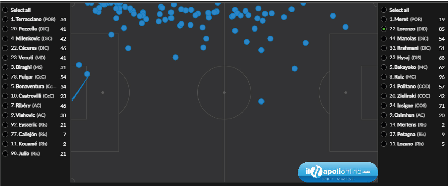Le statistiche della partita dicono che il i tocchi per il Napoli sono di 643 rispetto agli avversari con 481. Ma più nello specifico prendiamo in considerazione i due che hanno toccato più palla in tutta la partita, ovvero Di Lorenzo (figura 5) e Fabian Ruiz (figura 6). Il terzino azzurro, Di Lorenzo ha toccato 85 volte la palla, ovviamente nella zona destra del campo. Mentre lo spagnolo, Ruiz ha toccato la palla più di tutti ovvero 96 volte, ma a differenza del terzino ha svariato molto di più, ma la densità maggiore che si nota (figura 6), è tra il centrocampo e dove più si va verso la trequarti più il centrocampista tende ad allargarsi.