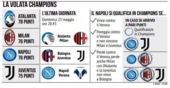 Sono ancora tutte lì. Milan, Napoli e Juventus: in tre per due posti. Sì, perché l’Atalanta ha già staccato il pass per la prossima edizione di Champions League. Vincendo contro il Genoa e approfittando dei risultati delle altre contendenti, la squadra di Gasperini si è assicurata un posto nell’Europa che conta anche per la stagione 2021-22. Nell’ultimo rovente turno di campionato, però, l’Atalanta non ricoprirà un ruolo marginale perché riceverà a Bergamo il Milan, una delle tre squadre ancora in ballo.