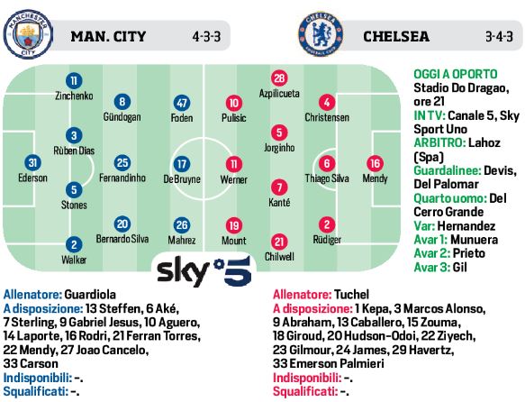 Per il secondo anno consecutivo è il Portogallo ad ospitare l’epilogo più atteso della stagione calcistica europea (per club). Il Manchester City di Guardiola, come quasi tutta la Champions League, giocherà senza un vero centravanti. Punterà tutto su De Bruyne come falso nueve, Foden e Mahrez esterni d’attacco. Il Chelsea invece avrà in Timo Werner il suo terminale offensivo. A centrocampo l’ex Napoli Jorginho con Kantè al suo fianco. Difesa a te per Tuchel.