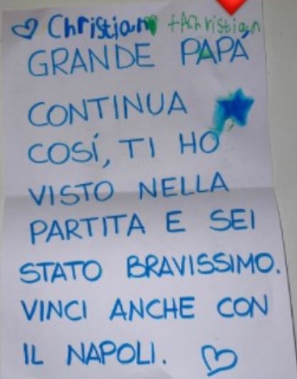 quella di suo marito in campo. Insomma, il calore di cui aveva bisogno Lorenzo per ripartire. Nella tarda serata, poi, sono arrivate anche le lettere dei due figli, Carmine e Christian. Due letterine scritte a mano piene di amore e complimenti per quel papà che ancora una volta si è trasformato nel supereroe del loro cuore. «E adesso vinci anche col Napoli».