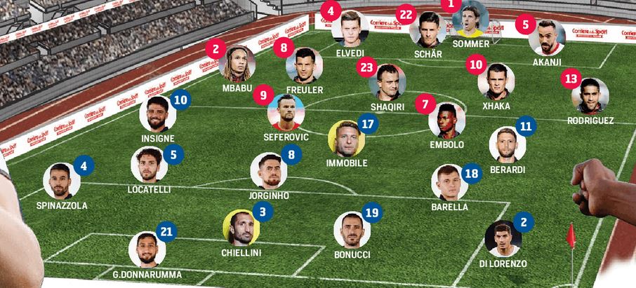 Questa sera allo stadio Olimpico, fischio d’inizio alle ore 21,00, l’Italia affronterà la Svizzera, con l’obiettivo dei tre punti e qualificarsi per gli ottavi di finale in anticipo. Per il c.t. Roberto Mancini un solo dubbio, nel ruolo di terzino destro, tra Di Lorenzo e Toloi, verrà sciolto in mattinata. Per il resto gli stessi giocatori della prima sfida, con Berardi, Immobile e Insigne nel tridente offensivo. Gli elvetici punteranno sul talento Embolo e sull’estro di Shaquiri. Per il resto Petkovic giocherà con la difesa a tre, mentre in porta l’esperto Sommer.