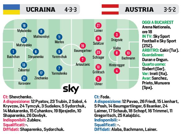 Ucraina-Austria, lo spareggio per il secondo posto nel girone C. Da questa gara uscirà la prossima avversaria dell’Italia nel suo cammino ad Euro 2020. Le due nazioni che, rispettivamente nel 2012 e nel 2008, sono state co-organizzatrici dell’Europeo si contendono oggi a Bucarest il pass per gli ottavi, che potrebbe anche arrivare per tutte e due. In classifica sono appaiate a 3 punti dietro all’Olanda, a punteggio pieno e già qualificata da prima. Un pareggio potrebbe accontentarle entrambe: l’Ucraina sarebbe certa del passaggio del turno da seconda, per via del maggior numero di reti segnate, mentre l’Austria avrebbe altissime possibilità di essere tra le quattro migliori terze classificate dei sei raggruppamenti che completeranno la lista delle partecipanti agli ottavi.