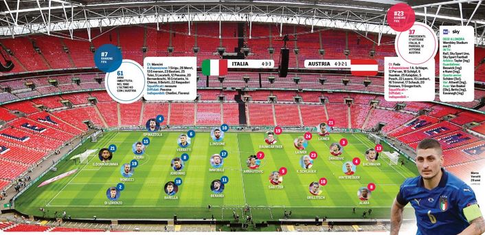 Questa sera allo stadio di Wembley, fischio d’inizio alle ore 21,00, si giocherà l’ottavo di finale tra l’Italia e l’Austria. Il c.t. degli azzurri Roberto Mancini ha un solo dubbio di formazione, chi a centrocampo tra Verratti e Locatelli. Per il resto a destra Di Lorenzo e Insigne sulla sinistra in attacco con Immobile e Berardi. Per la squadra di Foda sarà 4-1-4-1, con Alaba terzino sinistro. In attacco Arnautovic con alle spalle tra gli altri il talento di Sabitzer del Lipsia e la forza fisica di Baumgartner.