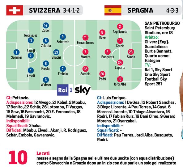 Svizzera e Spagna arrivano ai quarti dopo percorsi molto simili. Alla fine della seconda giornata erano più fuori che dentro. Petkovic aveva pareggiato con il Galles ed era stato schiantato dall’Italia, Luis Enrique aveva fatto 0-0 contro la Svezia e 1-1 contro la Polonia. Stavano cercando tutt’e due un punto d’equilibrio. Trovato alla terza giornata, la Svizzera con il 3-1 sulla Turchia, la Spagna con il 5-0 sulla Slovacchia. Agli ottavi, l’impresa degli elvetici e il bis dei 5 gol spagnoli ai croati. Ora sono squadre vere. Fonte e grafico CdS