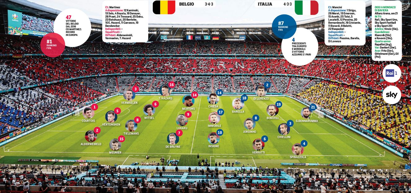 Questa sera all’Allianz Stadium di Monaco di Baviera, fischio d’inizio alle ore 21,00, ci sarà la sfida tra il Belgio e l’Italia, valevole per i quarti di Euro 2020. In casa dei fiamminghi, sembra che possa recuperare De Bruyne, mentre Eden Hazard invece no con ogni probabilità. Pronto Mertens a giocare nel tridente assieme a Lukaku e al giocatore del Manchester City. In casa azzurra Chiesa in vantaggio su Berardi, mentre oggi si scioglierà il dubbio in difesa Chiellini oppure Acerbi. Per il resto in campo Di Lorenzo a destra e Insigne nel tridente offensivo.