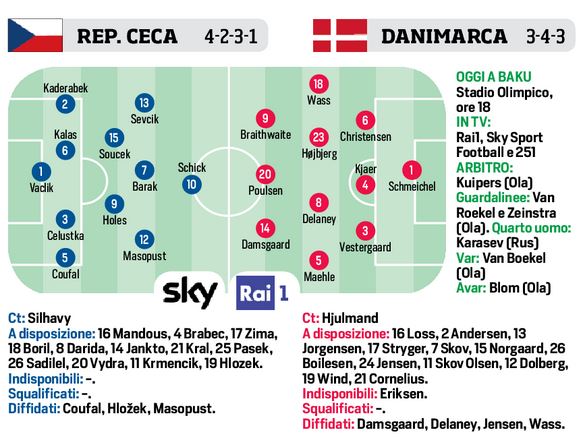 Ore 18,00 – Euro 2020: Rep Ceca/Danimarca, le probabili formazioni