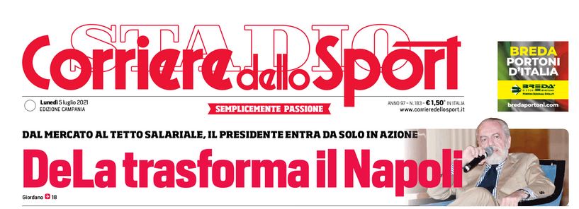 NewsCalcioIn Evidenza CdS Campania – Il presidente trasforma il Napoli. AdL entra da solo in azione” By Giuseppe Sacco il Lug 5, 2021 - 08:00:41 0 Condividi In prima pagina e nel profilo interno del CdS edizione Campania Factory della Comunicazione ADLcalcimercatoCalciomercato. 0 Condividi FacebookTwitterGoogle+ReddItWhatsAppPinterestE-mail