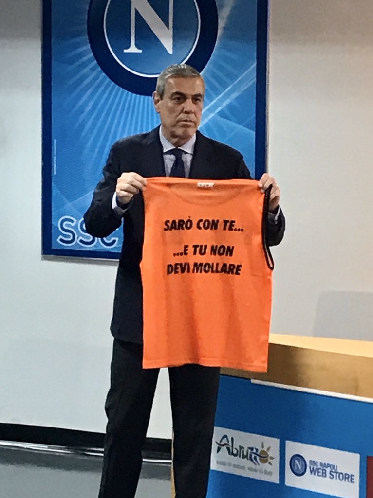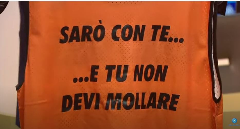 Si mostra la casacca di allenamento con su scritto: “Sarò con te… e tu non devi mollare”