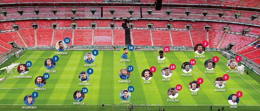 Questa sera a Wembley si giocherà la finale di Euro 2020 tra i padroni di casa dell’Inghilterra e l’Italia. Per gli azzurri c’è l’occasione per salire sul tetto d’Europa e per farlo punterà sull’11 base visto contro la Spagna. Si deciderà all’ultimo sull’attacco con Immobile in vantaggio su Belotti. Per la squadra del c.t. Southgate invece un dubbio sull’esterno destro d’attacco Saka oppure Foden, con quest’ultimo non al meglio fisicamente. Per il resto Kane di punta e occhio a Sterling del City.