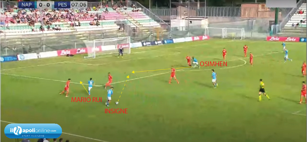Molto spesso ieri gli attaccanti azzurri erano alla ricerca della profondità, in maniera più costante veniva ricercato Osimhen, con un lancio lungo soprattutto da Mario Rui sulla sinistra; da notare che questo schema è stato molto provato nei giorni a Castel di Sangro, quindi sarà una giocata che molto probabilmente rivedremo spesso durante il campionato.