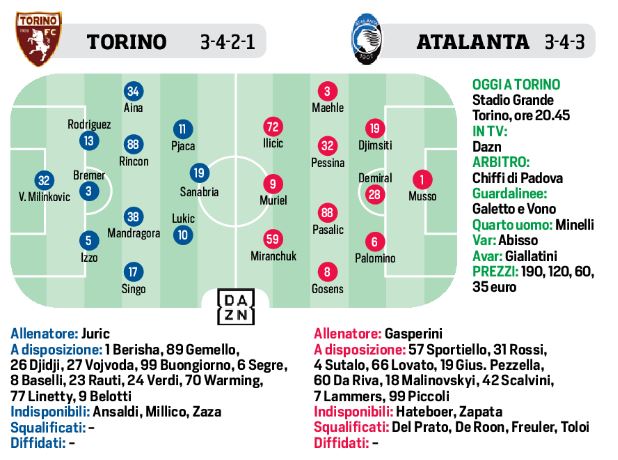 Serie A – Ore 20,45: Torino-Atalanta, le probabili formazioni