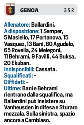 Domenica pomeriggio alle ore 18,30 allo stadio Luigi Ferraris, il Genoa affronterà il Napoli per la seconda giornata di campionato. Per i rossoblù di Ballardini, occasione per riscattare la sconfitta contro l’Inter. In attesa di novità dal mercato, sarà 3-5-2 con Cambiaso e Sbaelli ai lati. In attacco spazio a Pandev e Kallon. In difesa giocherà il capitano Criscito. Per gli azzurri due le novità. A centrocampo Elmas al posto di Zielinski, mentre in attacco Insigne come falso nueve al posto dello squalificato Osimhen.