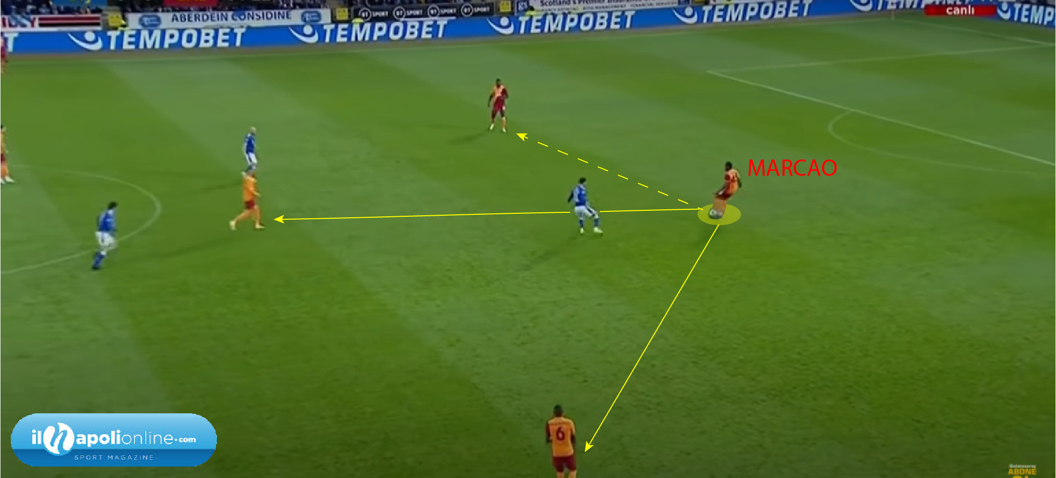 In più il brasiliano è dotato di una ottima visione di gioco e freddezza che gli permettono di vedere subito la giocata (vedi immagini); infatti è sempre alla ricerca del compagno libero da avversari, ed in alcuni casi porta palla finchè non lo raddoppiano fino a creare superiorità in un’altra zona di campo. Ha dalla parte sua anche la precisione e la potenza giusta nei passaggi.