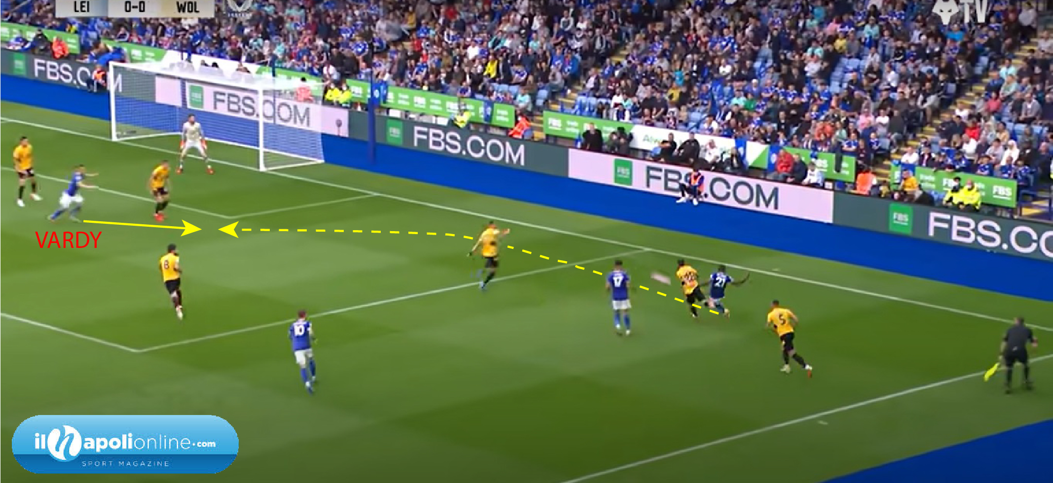 I due difensori centrali commettono molti errori di posizione, ne è l’esempio il goal subito contro il West Ham (figura 7), dove Amartey rompendo la linea difensiva lascia i compagni al centro dell’area in inferiorità numerica. Diversamente l’altro difensore centrale Soyuncu, commette molti errori nei passaggi (figura 8), appena pressato e con le dovute chiusure delle linee di passaggio da parte degli avversari tende a commettere l’errore. L’unico goal degno di nota (in quanto uno è arrivato su rigore e l’altro su un rimpallo vinto in area) è quello contro il Wolves, goal messo a segno da Vardy che leggendo il cross teso del compagno anticipa il difensore avversario siglando il goal partita.