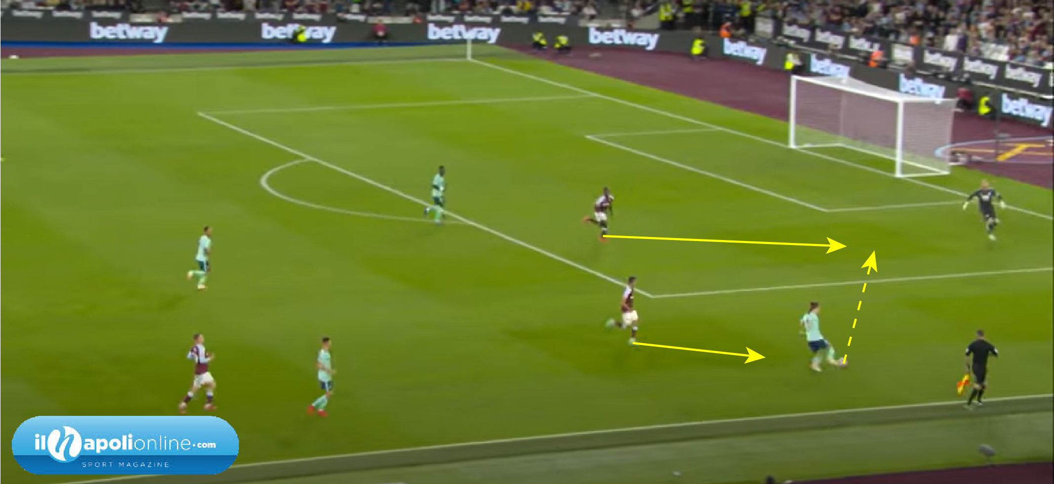 La difesa inglese sembra scricchiolare in alcuni momenti, ne abbiamo analizzati alcuni nelle tre partite giocate, ma molti si ripetono spesso. Ad esempio il contropiede subito su calcio d’angolo a favore (figura 5), è un qualcosa che il Leicester concede molto spesso durante le partite, in quanto ha dalla sua molti saltatori. La difesa che si va a schiacciare molto sul portiere lasciando libero il limite dell’area (figura 6), con i mediani davanti la difesa che non riescono ad essere presenti così creando un buco, ricordando quelli dove Insigne o Zielinski si inseriscono facilmente.