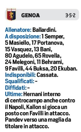 Domenica pomeriggio alle ore 18,30 allo stadio “Luigi Ferraris”, il Genoa affronterà il Napoli per la seconda giornata di campionato. Per il grifone, in attesa di conoscere il mercato, vicinissimi Maksimovic e Caicedo, dovrà schierare al momento la stessa formazione. A centrocampo novità Hernani Junior al posto del giovane Rovella. In attacco Pandev e uno tra Kallon e Favilli al suo fianco. Difesa a tre per Ballardini. Spalletti dovrà invece puntare sul tridente leggero: Lozano e Politano ai lati, con Insigne “falso nueve”. Out tra gli altri Ounas, Zielinski e Demme, oltre allo squalificato Osimhen.