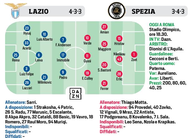 Serie A – Ore 18,30: Lazio/Spezia. Le probabili formazioni