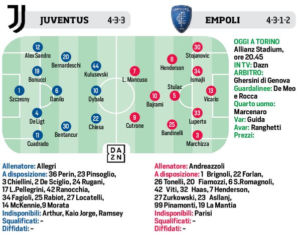 Serie A – Ore 20,45: Juve/Empoli, le probabili formazioni