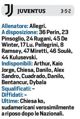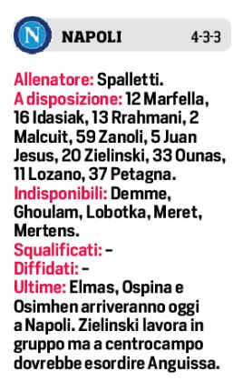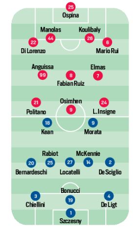 Domani alle ore 18,00 allo stadio “Maradona”, il Napoli affronterà la Juventus per la terza giornata di campionato. In casa azzurra c’è il dubbio sul modulo, 4-2-3-1 o 4-3-3? Tutto dipenderà dal recupero di Zielinski che ieri si è allenato con il gruppo. Certo comunque il debutto di Anguissa nella linea mediana. Attacco composto da Politano e Insigne ai lati, Osimhen al centro. Sulla sponda bianconera invece sarà un 3-5-2, con assente Chiesa, centrocampo a cinque, mentre in attacco spazio al duo: Morata-Kean, con Kulusevski in preallarme.