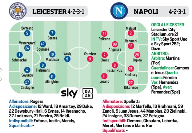 Questa sera alle ore 21,00 al “King Power Stadium”, il Leicester affronterà il Napoli per la prima giornata della fase a gironi di Europa League. Per i padroni di casa di Brendan Rodgers sarà 4-2-3-1, con Vardy terminale offensivo e alle sue spalle Albrighton, Maddison e Barnes. In casa azzurra Spalletti ha due ballottaggi. A sinistra Di Lorenzo in leggero vantaggio su Juan Jesus, mentre in avanti Insigne o Politano, con l’ex di Inter e Sassuolo in leggero vantaggio sul capitano. Per il resto Rrahamani al fianco di Koulibaly in difesa ed Elmas in vantaggio su Zielinski.