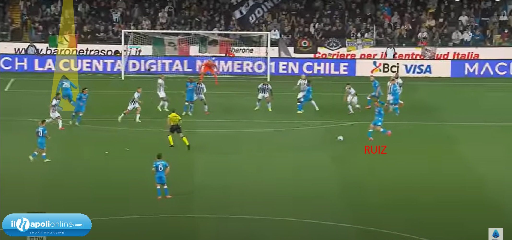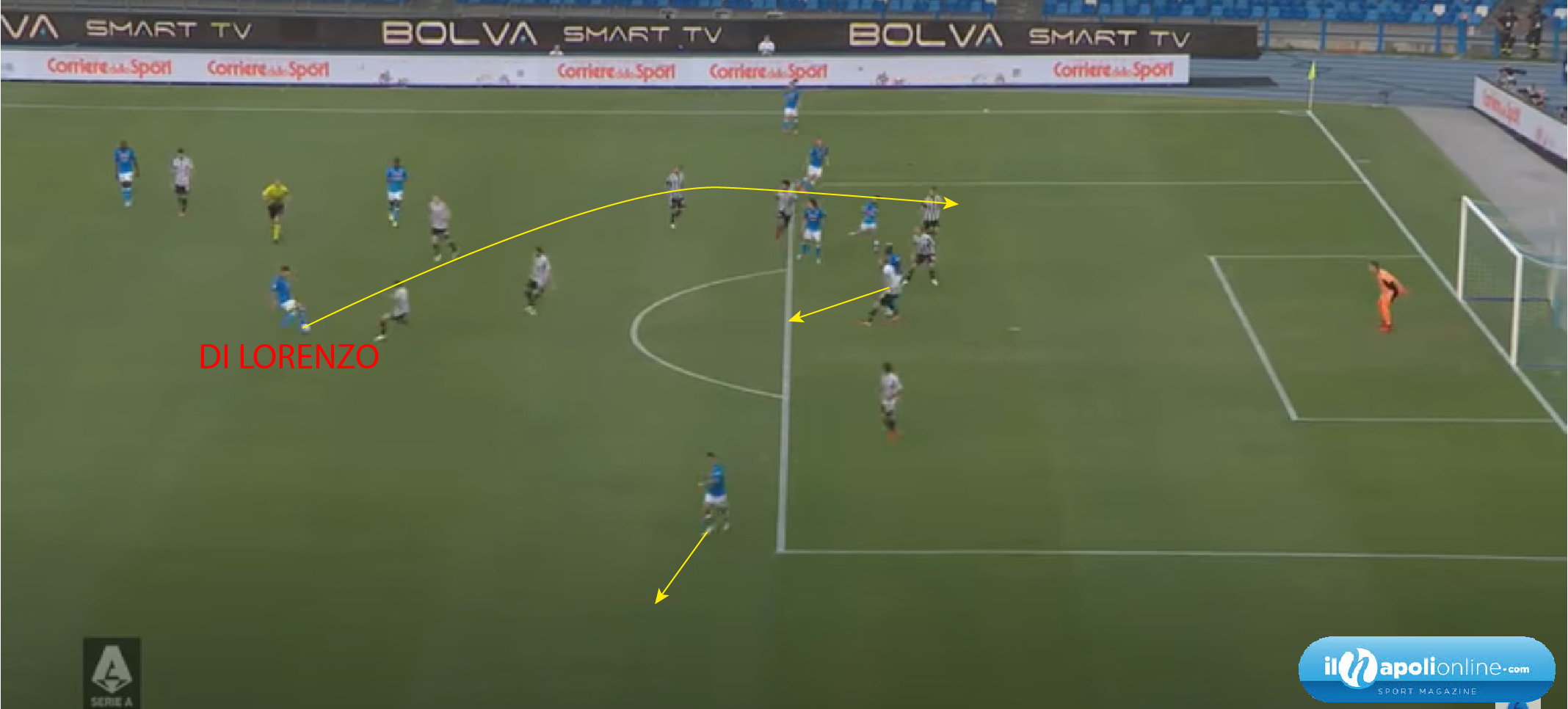 I terzini che salgono all’interno del campo, invece di sovrapporsi solo, è un’altra chiave che ha aggiunto Spalletti, al gioco del suo Napoli. Mario Rui contro l’Udinese (figura 5), si è trovato molte volte in quella zona del campo; in questa figura poi la palla arriverà a Ruiz che prenderà il palo, ma il movimento del terzino ha creato superiorità ai suoi. Così come evidenziato nella partita contro la Juventus, la posizione di Di Lorenzo è stata quella di accentrarsi. Il loro movimento a portarsi al centro del campo, permette alle mezzali di alzarsi e di inserirsi, così da ottenere sempre degli uomini a rimorchio pronti a pressare.