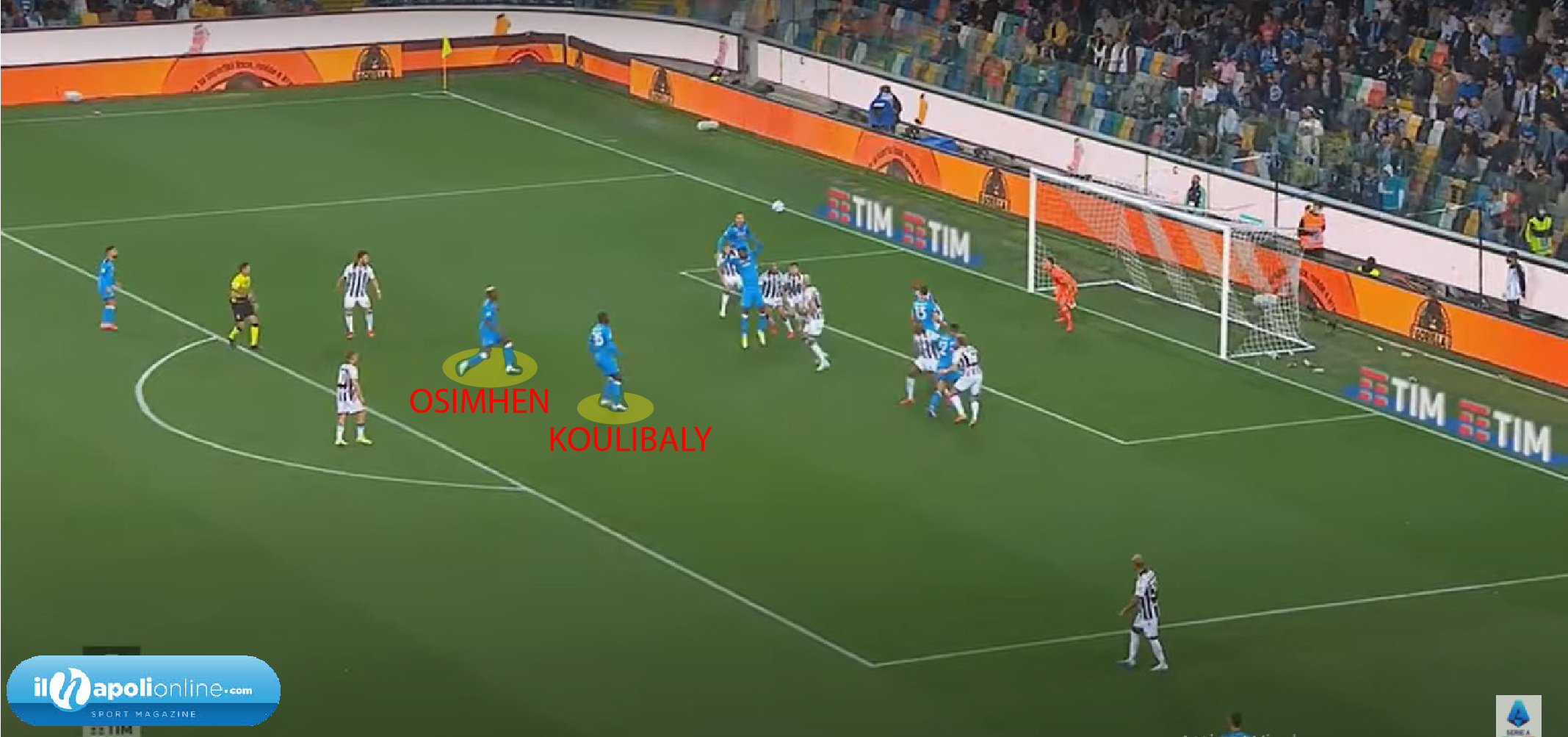 Altro dettaglio che ha fatto la differenza nella partita di ieri, ma come sta accadendo già dall’inizio del campionato, sono i giocatori a rimorchio. Subito pronti per una seconda palla, e subito pronti a pressare alto gli avversari per evitare ripartenze. Sul cross di Politano (figura 3), vediamo che Koulibaly non va ad attaccare la porta, seppur potrebbe farlo in quanto bravo di testa; ma resta a rimorchio ed il compagno Ruiz lo serve egregiamente, dove il difensore scarica un bolide per terzo goal azzurro. Stessa cosa accade in altra azione dove su calcio di punizione laterale di Politano, il colpo di testa di Anguissa finisce con una bella parate del portiere; ma si vedono (figura 4), Koulibaly ed Osimhen restare fuori dalla linea difensiva, per essere pronti a ricevere qualche palla “sporca”.