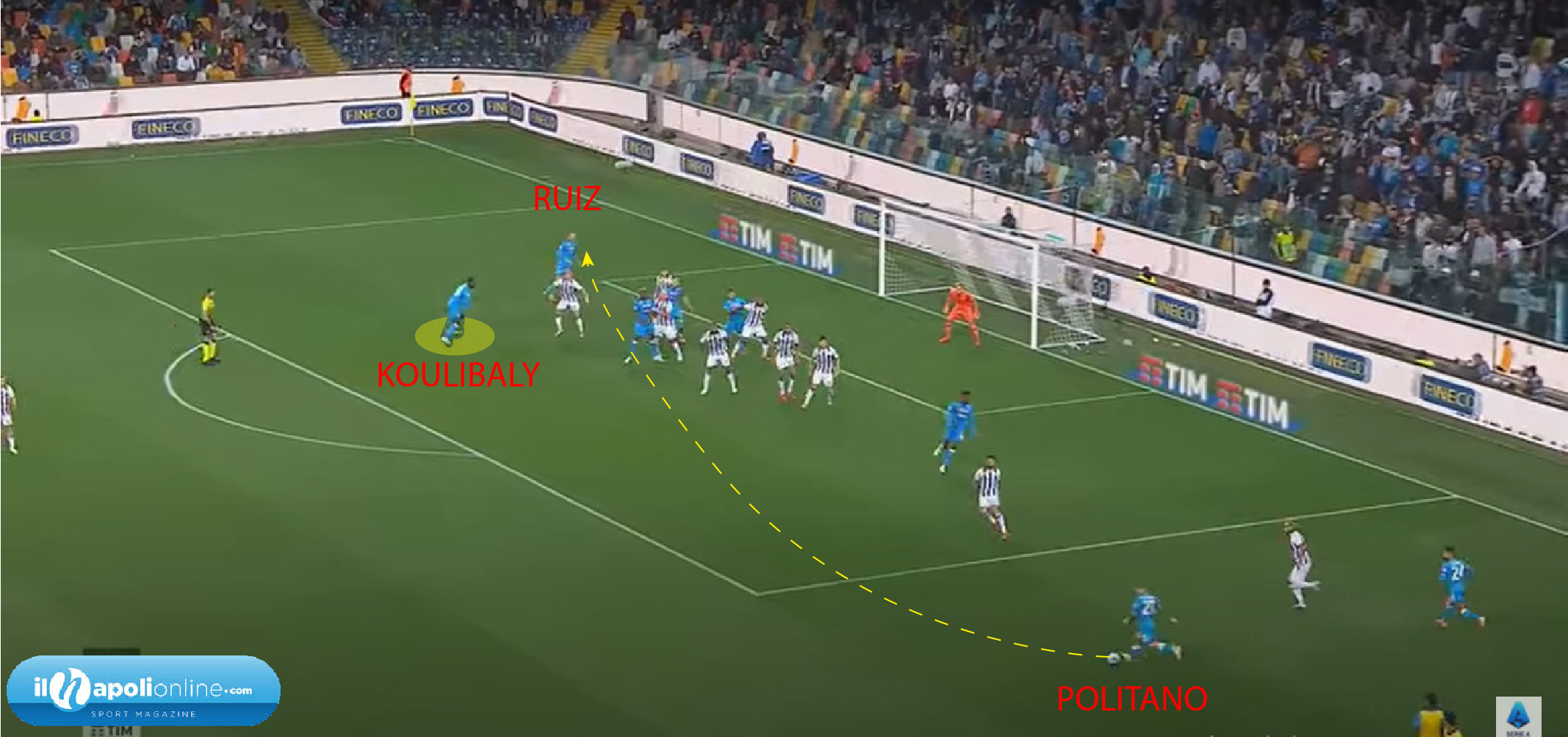 I dettagli fanno la differenza e con questo Napoli, Spalletti sta curando sempre più il piccolo dettaglio. Anche la posizione in campo degli azzurri è diventata migliore con il tecnico. Il calcio di punizione provato in allenamento fa notare subito che uno di migliori marcatori di testa, ovvero Koulibaly, stia al limite dell’area e non al secondo palo come siamo stati abituati a vederlo. Un po’ come visto con Petagna contro il Genoa, posizionato al primo palo; qui vediamo (figura 1), Koulibaly fare un movimento a tagliare dietro la difesa, con la palla che va’ dall’altro lato e Ruiz che senza guardare mette palla sulla corsa del difensore (figura 2). Da notare nella seconda figura che Koulibaly si “disinteressa” della palla, in quanto sa già che verrà servito sulla corsa; rispetto agli avversari che sono tutti attenzionati a guardare la palla in movimento.