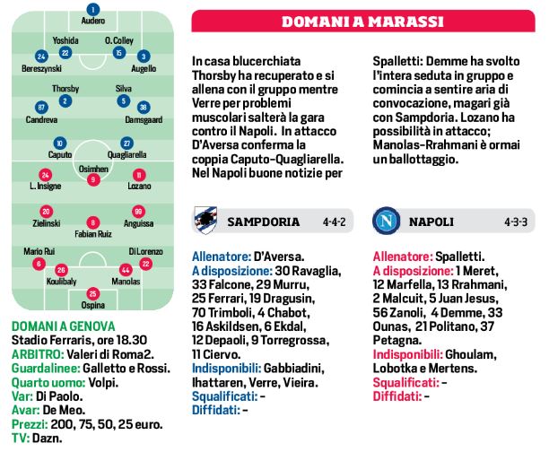 Domani pomeriggio il Napoli affronterà allo stadio “Luigi Ferraris” i padroni di casa della Sampdoria per la quinta di campionato. I liguri, dopo il successo di Empoli, cercano conferme anche in casa. Il tecnico D’Aversa schiererà il 4-4-2, con i recuperi di Thorsby e Adrien Silva a centrocampo. In avanti spazio a Quagliarella e Caputo. Per Spalletti la buona notizia è il rientro tra i centrocampisti di Demme. Ballottaggi in difesa: Manolas-Rrahamani, a centrocampo: Zielinski-Elmas e in avanti: Lozano-Politano. Dubbi che verranno sciolti nelle ore prima della gara.