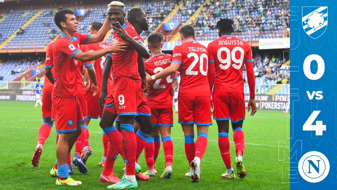 Osimhen che in spaccata impreziosisce un lancio delizioso di Insigne. Poi ancora Lorenzo appoggia per il rimorchio di Fabian che accarezza il pallone e infila il palo con un sinistro di velluto puro. Andiamo al riposo con l’urlo del popolo napoletano a Marassi. E rientriamo in campo per trasformarlo in sinfonia. Osimhen trafigge ancora la Doria su assist di Lozano e griffa la sua doppietta, nonchè il quinto gol in una settimana tra coppa e campionato. Prima che arrivi l’ora è Zielinski che scocca la freccia che centra e polverizza il bersaglio blucerchiato col poker azzurro. Dal 22 agosto al 23 settembre, un mese di azzurro radioso e splendente. Gimme five! Le cinque giornate di Napoli”!