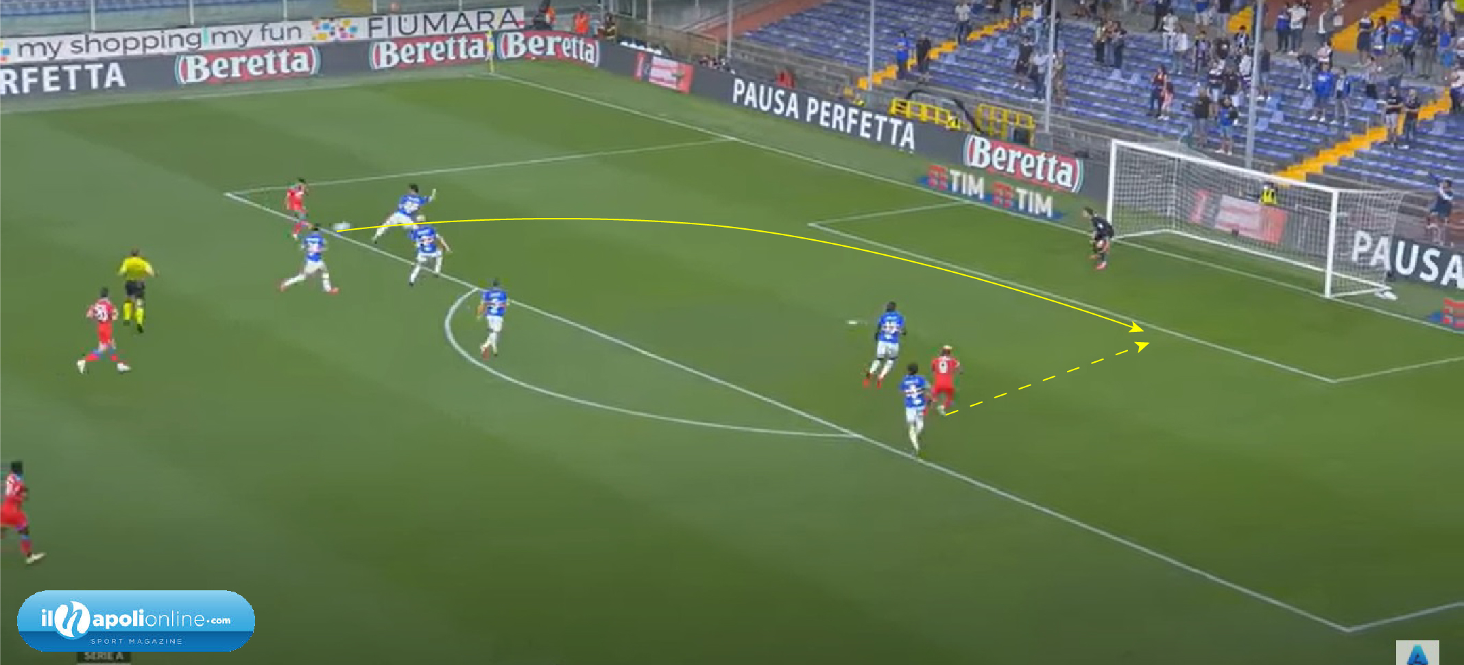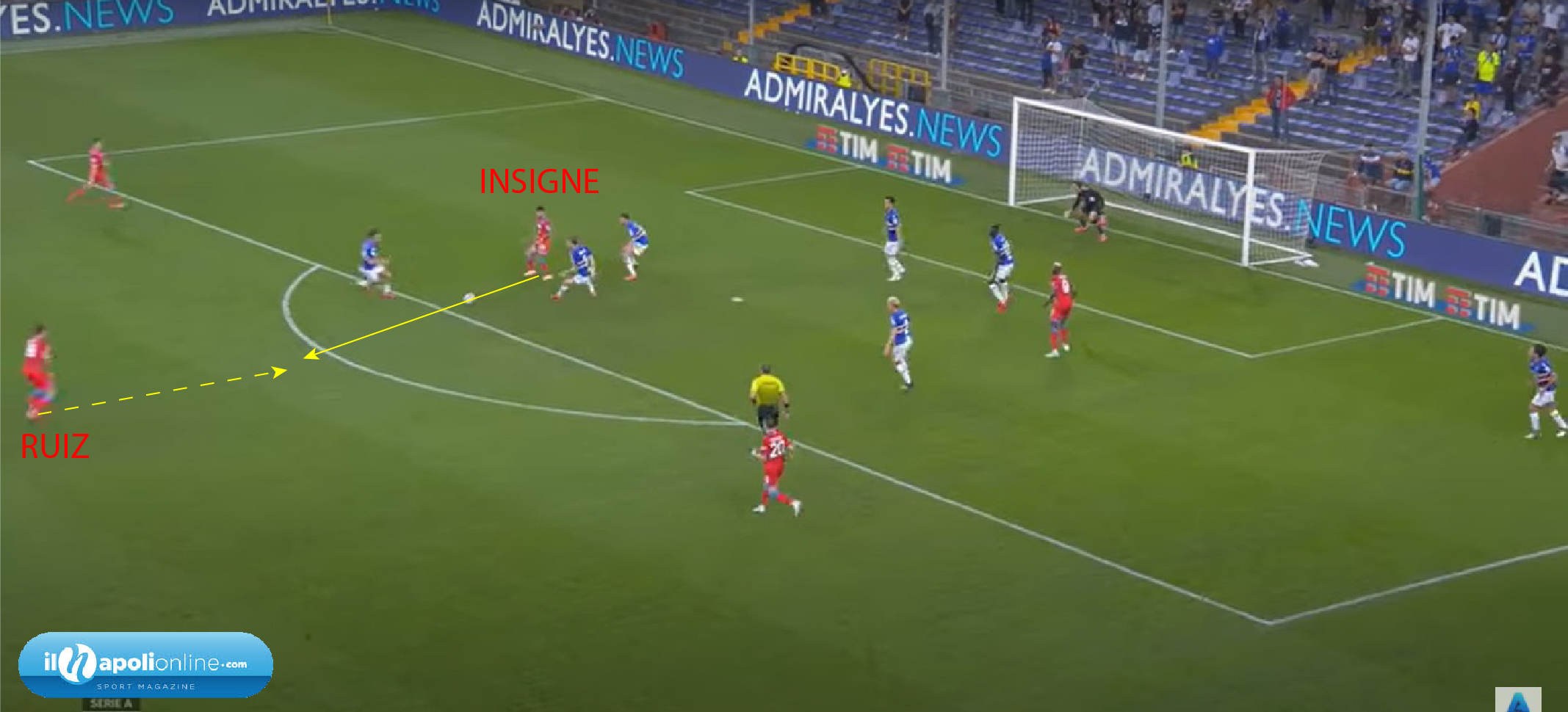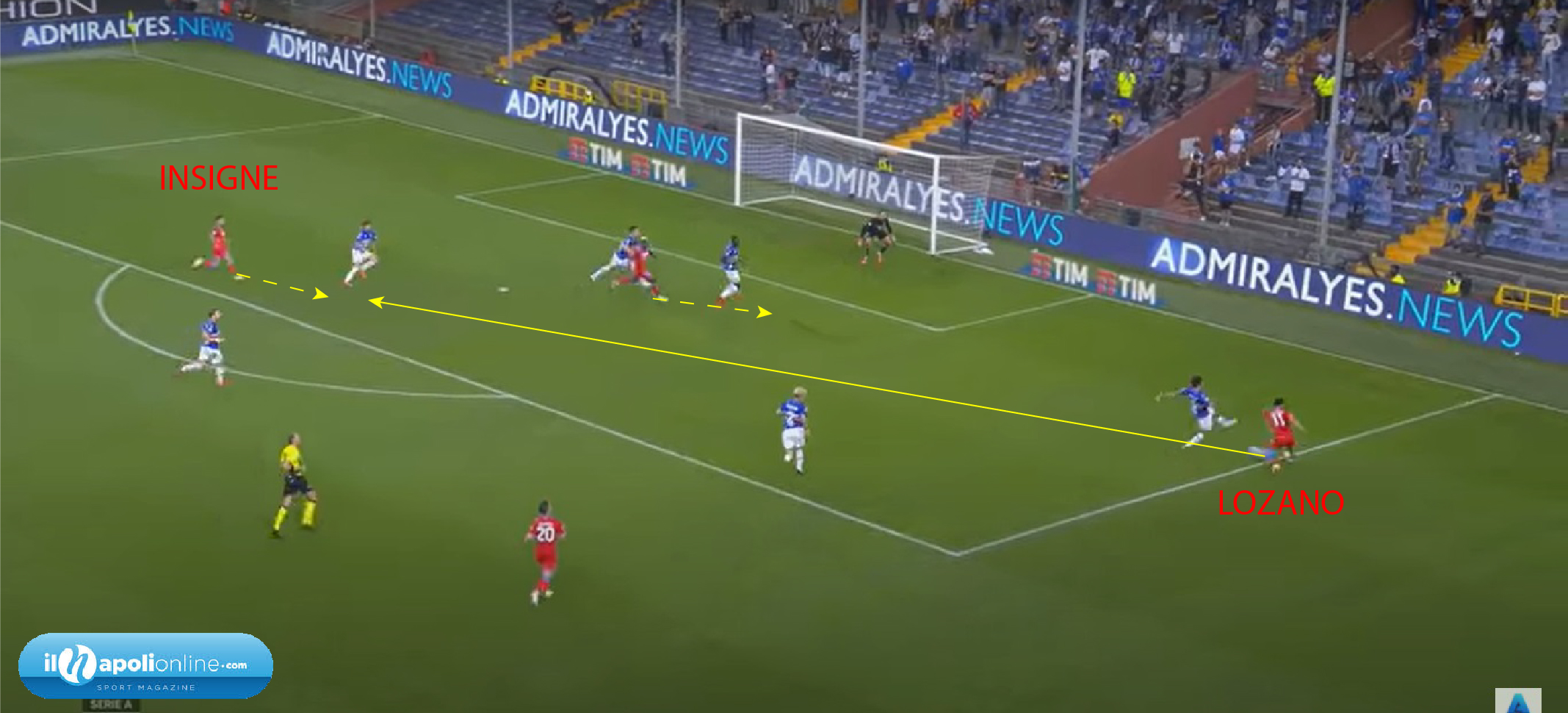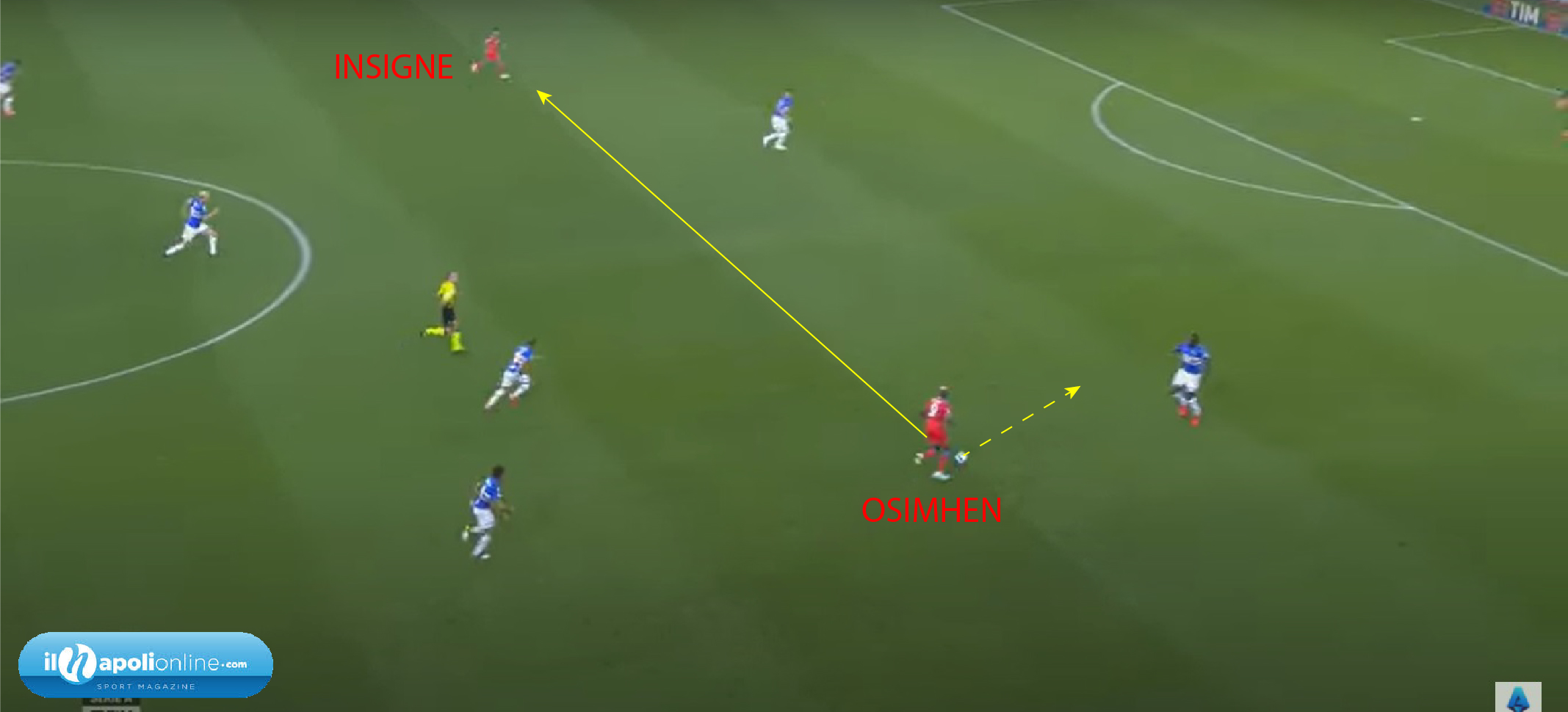 Primo goal che nasce da una palla recuperata da Osimhen nei pressi del centrocampo; l’attaccante azzurro conscio che è più bravo in campo aperto, piuttosto che come portatore di palla, la passa ad Insigne sulla fascia sinistra (figura 1), e va in attacco alla profondità. Il capitano azzurro arrivato al limite dell’area alzando la testa, vede il contro-movimento del 9 azzurro, che attaccando il secondo palo (figura 2), e con la complicità e l’errore dell’estremo difensore blucerchiato, porta in vantaggio i suoi.