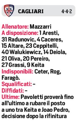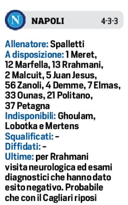 Domani sera allo stadio “Maradona”, fischio d’inizio alle ore 20,45, il Napoli punterà alla sesta vittoria di fila, contro il Cagliari in cerca di punti per la salvezza. Per Spalletti buone notizie per Rrahamani, controllo ha dato esito negativo, ma probabilmente verrà fatto riposare, pronto Manolas. Per il resto la novità potrebbe essere Politano al posto di Lozano. In casa dei sardi invece si punterà sugli elementi di esperienza come Godin e Strootman. In attacco spazio al duo Joao Pedro e Pavoletti.
