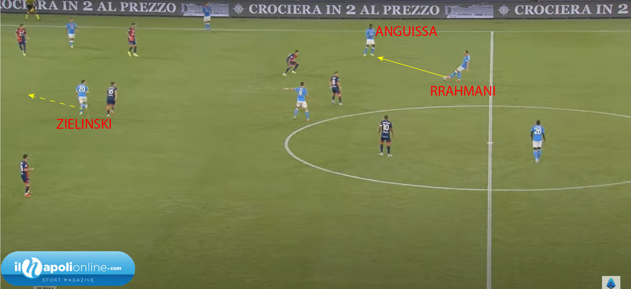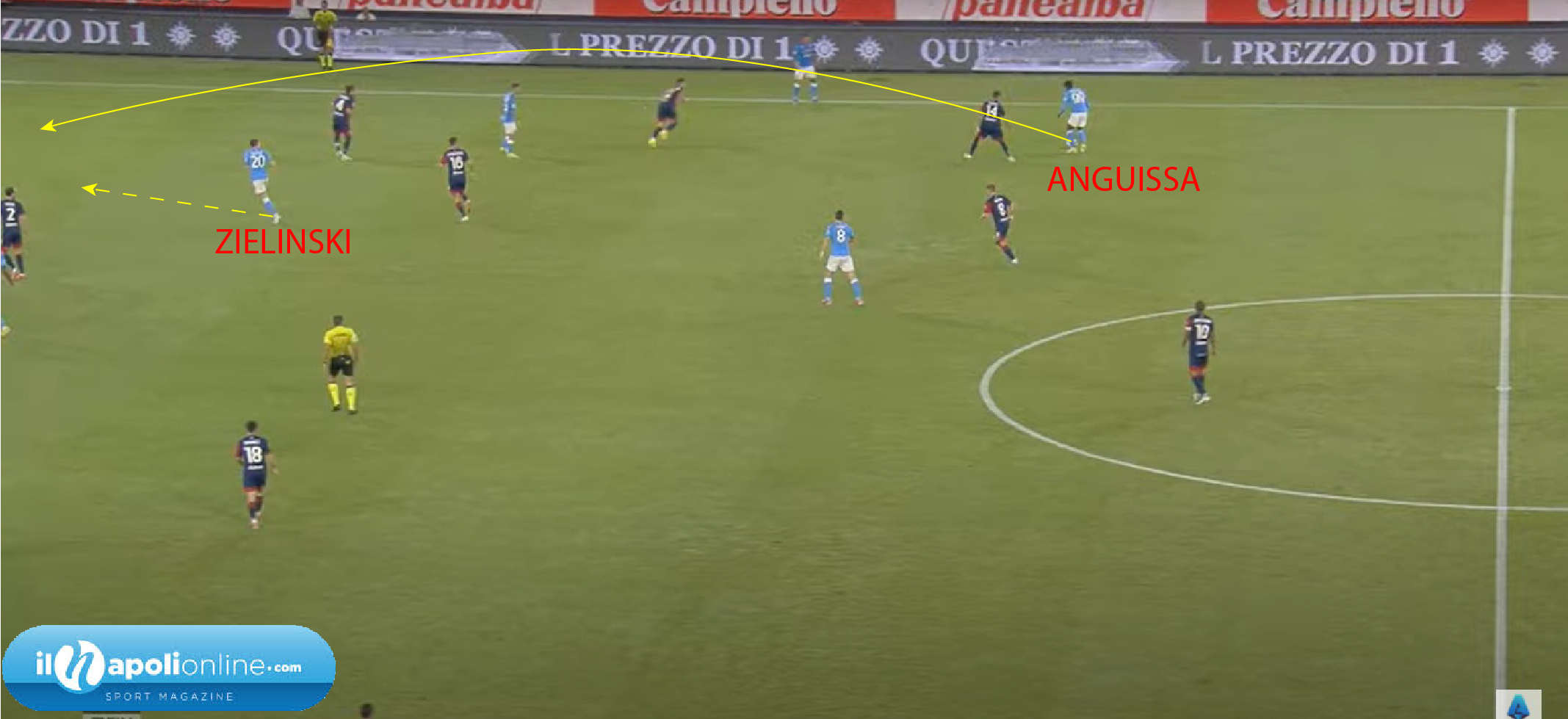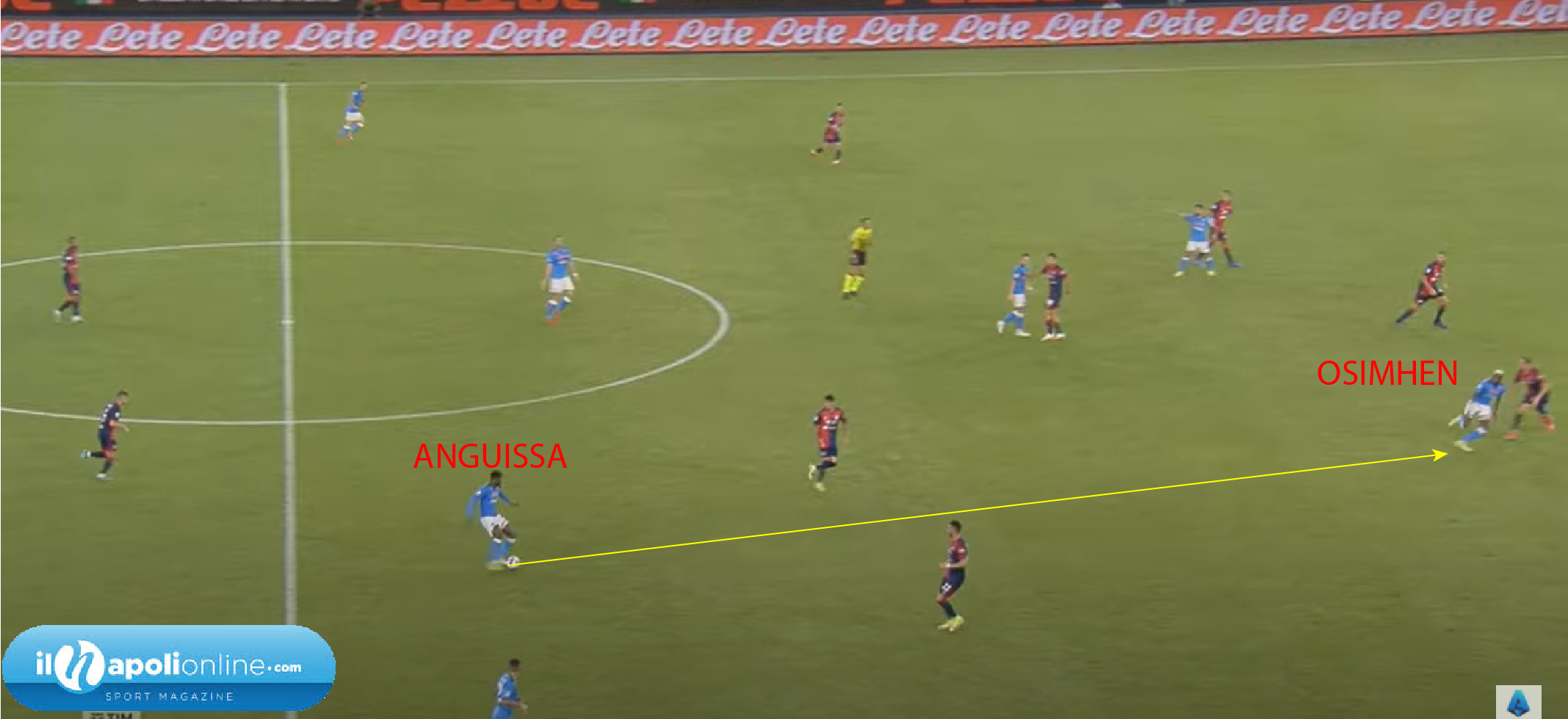 Primo goal che evidenzia ancora una volta le qualità del centrocampista azzurro Anguissa (qui ne abbiamo evidenziato alcune); la giocata preparata in allenamento prevede il movimento ad allargarsi di Anguissa, per attirare i centrocampisti avversari (figura 1). Lo stesso riceve palla da Rrahmani, nel frattempo Zielinski si inserisce tra terzino e difensore centrale sinistro avversario (figura 2). La palla sembra essere lunga, ma il trequartista azzurro riesce ad arrivarci e mettere di prima al centro; dove il compagno Osimhen tagliando al primo palo anticipa tutti per siglare il vantaggio partenopeo (figura 3).
