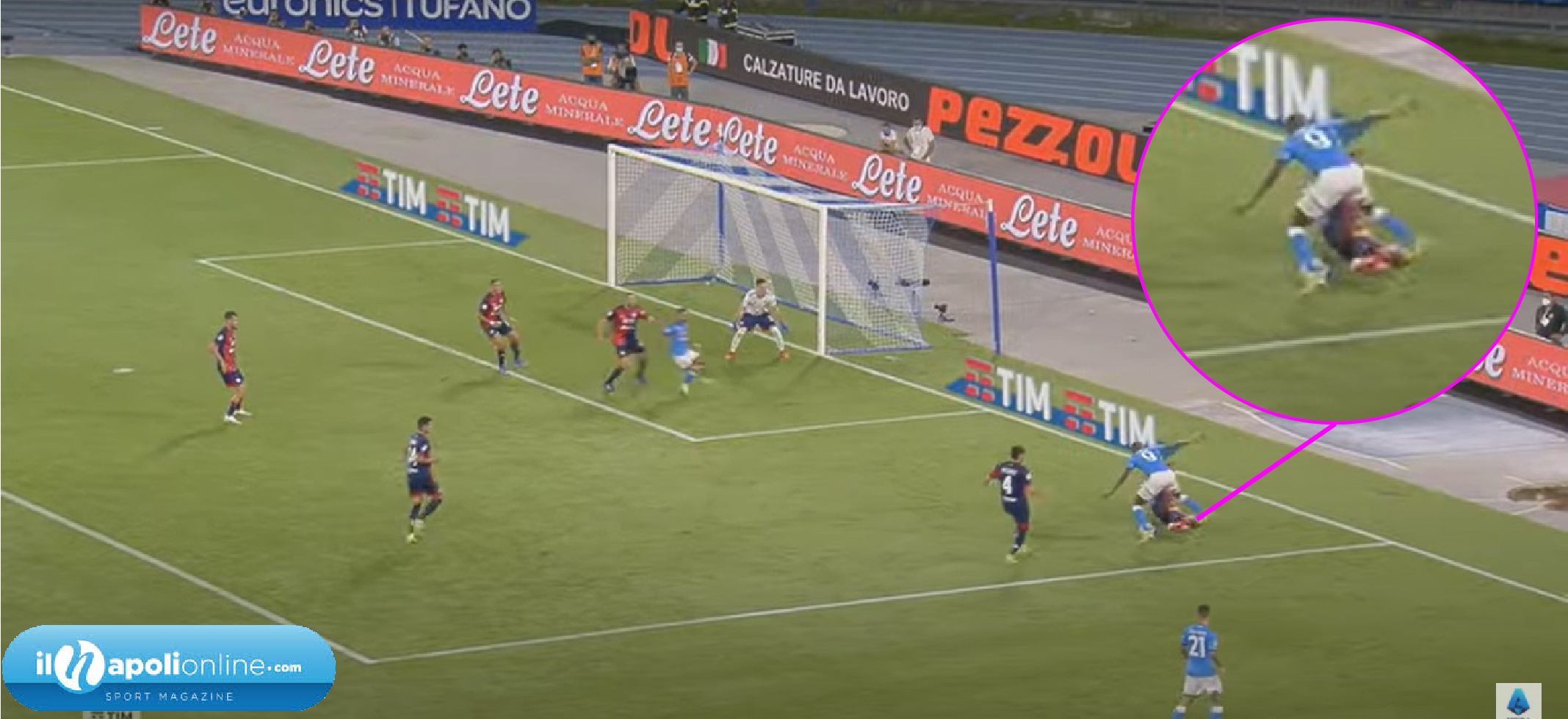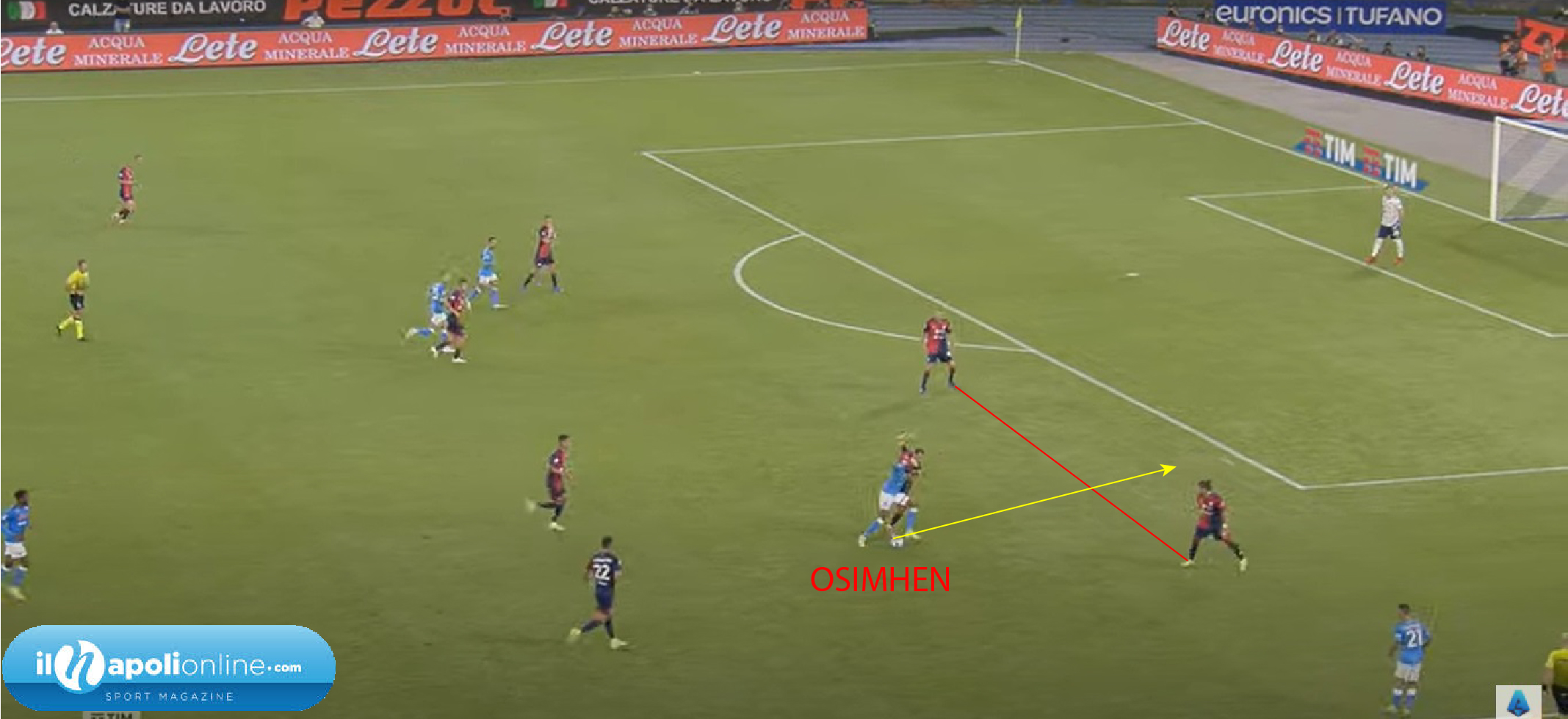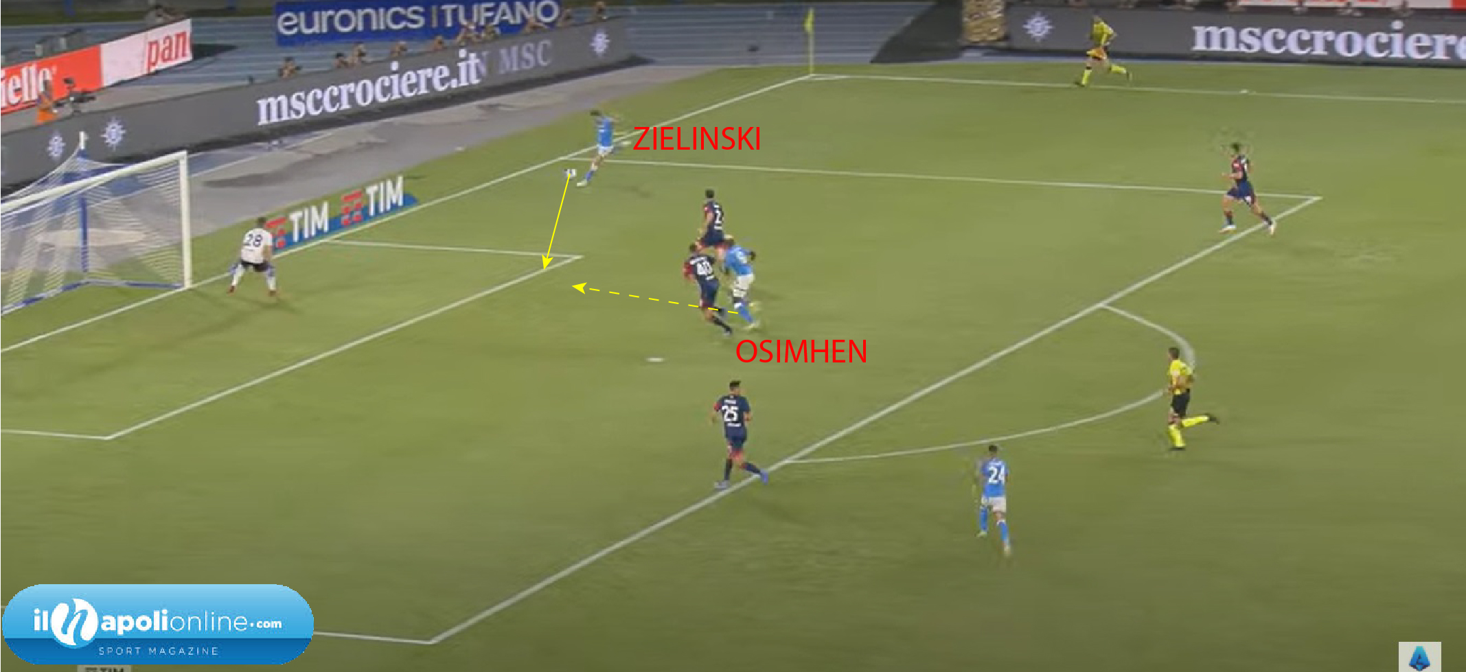 Secondo goal che parte nuovamente da Anguissa, dove trova uno spazio verticale per l’attaccante azzurro (figura 4); Osimhen dapprima che voleva attaccare la profondità si trova palla nei piedi, e potrebbe scaricarla anche esternamente; ma la voglia di segnare è troppa e si porta l’avversario dietro attaccando la difesa avversaria dove c’è ancora un buco tra terzino e l’altro difensore centrale (figura 5). Arrivato quasi sul fondo decide di rientrare ed è qui che il difensore avversario lo falcia in area di rigore (figura 6). Sulla palla ci va il capitano Insigne che mette in rete per il 2a0 definitivo.