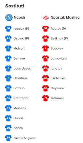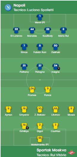 Sarà lo Spartak Mosca a dare il calcio d’avvio nella ripresa. Nel Napoli escono Petagna e Zielinski ed entrano Osimhen e Anguissa