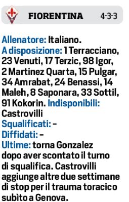 Dopo la sconfitta contro lo Spartak Mosca, il Napoli da oggi si proietterà in vista della trasferta di domenica contro la Fiorentina. La squadra viola allenata da Vincenzo Italiano recupera in attacco Gonzales, dopo il turno di squalifica, per il resto Vlahovic e Callejon a completare il reparto offensivo. A centrocampo Torreira in vantaggio su Pulgar. La difesa sarà a 4 con Nastasic che dovrebbe spuntarla su Martinez Quarta e Igor. Per Spalletti le novità sono: Rrahamani in difesa, Anguissa a centrocampo e Lozano in attacco.