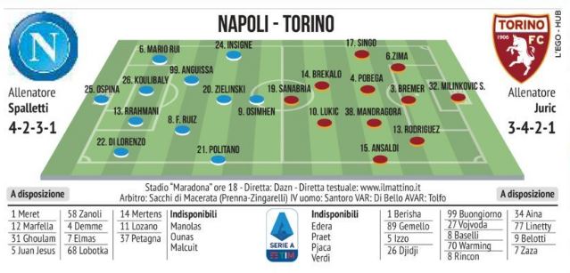 [Grafico] – Napoli/Torino: nonostante il fuso orario c’è Ospina in porta. Juric recupera a stento Belotti