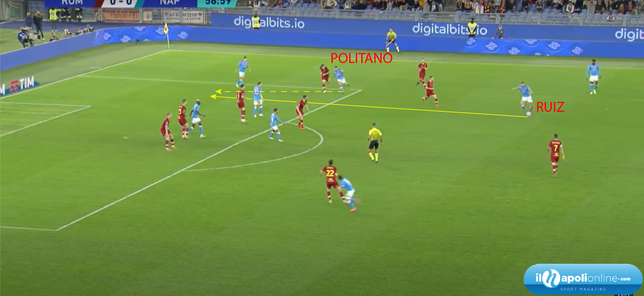 Non è stato il Napoli che abbiamo visto nell’ultimo periodo nella fase offensiva, quello cinico e vincente. Ma allo stesso tempo ha creato occasioni davvero importanti che hanno impensierito la retroguardia avversaria. La più importante nasce da un ottimo filtrante di Fabian Ruiz per per l’inserimento di Politano (figura 1); che da posizione defilata mette una palla verso il compagno al centro (figura 2). Osimhen forse con un rimpallo prende il palo, e la palla termina sull’accorrente Mario Rui; che di prima intenzione calcia verso la porta vuota; ma un ottimo intervento in scivolata evita il goal agli azzurri (figura 3). Ma in quest’azione possiamo vedere che il Napoli può variare tipologia di gioco a seconda degli avversari; infatti di solito da quel punto Ruiz prova a cambiare gioco, trovando o Mario Rui oppure Insigne largo, diversamente da qui che è al centro.