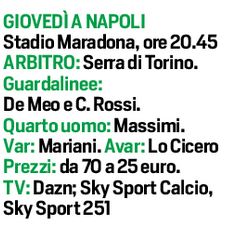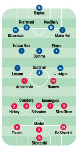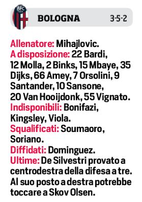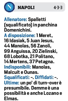 Giovedì sera al “Maradona”, fischio d’inizio ore 20,45, il Napoli, una delle due capolista, affronterà il Bologna, per la decima giornata di campionato. Pochi cambi per mister Spalletti, squalificato contro i felsinei, al suo posto Domenichini. Demme in vantaggio rispetto ad Anguissa, Elmas per Zielinski e Lozano in luogo di Politano. Per i rossoblu invece assenti per squalifica Soumoro e Soriano. Probabile la difesa a tre, con De Silvestri a destra. Centrocampo a cinque con Svamberg e Dominquez alle spalle del duo Arnautovic-Barrow.