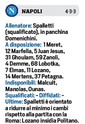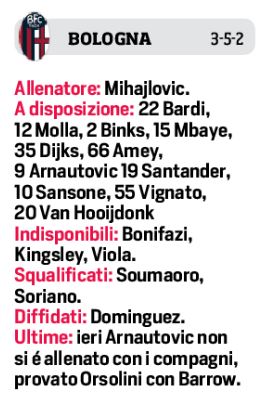 Domani sera alle ore 20,45 al “Maradona”, il Napoli affronterà il Bologna, per la decima giornata di campionato, con l’obiettivo di riagganciare il Milan al primo posto. Spalletti starebbe pensando, di effettuare un solo cambio di formazione, Lozano al posto di Politano. Per il resto ancora spazio a Zielinski e Anguissa, con Demme in panchina. In porta ancora spazio ad Ospina. Per Mihajlovic, il dubbio della vigilia è la presenza di Arnautovic che ieri non si è allenato con il gruppo. In caso di assenza dell’austriaco dal primo minuto, potrebbe giocare Orsolini al fianco di Barrow. Per il resto sarà 3-5-2, con De Silvestri al posto dello squalificato Souomoro e Svamberg più avanzato in luogo di Soriano.