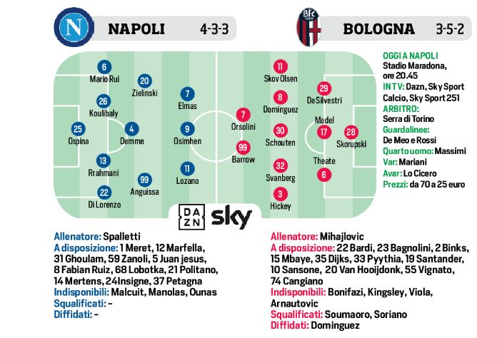 Questa sera al “Maradona”, fischio d’inizio alle ore 20,45, il Napoli punterà al successo contro il Bologna, per agganciare il Milan al primo posto. Il tecnico Luciano Spalletti, stasera squalificato, al suo posto Domenichini, effettuerà sue cambi. A centrocampo Demme è in vantaggio rispetto a Fabian Ruiz, al suo fianco Anguissa e Zielinski. In attacco possibile turno di riposo per Insigne, pronto Elmas, Lozano a destra e Osimhen al centro. In casa rossoblu, out Arnautovic, pronto Orsolini che affiancherà Barrow. Il modulo per Mihajlovic sarà il 3-5-2, De Silvestri sostituirà lo squalificato Soumoro.